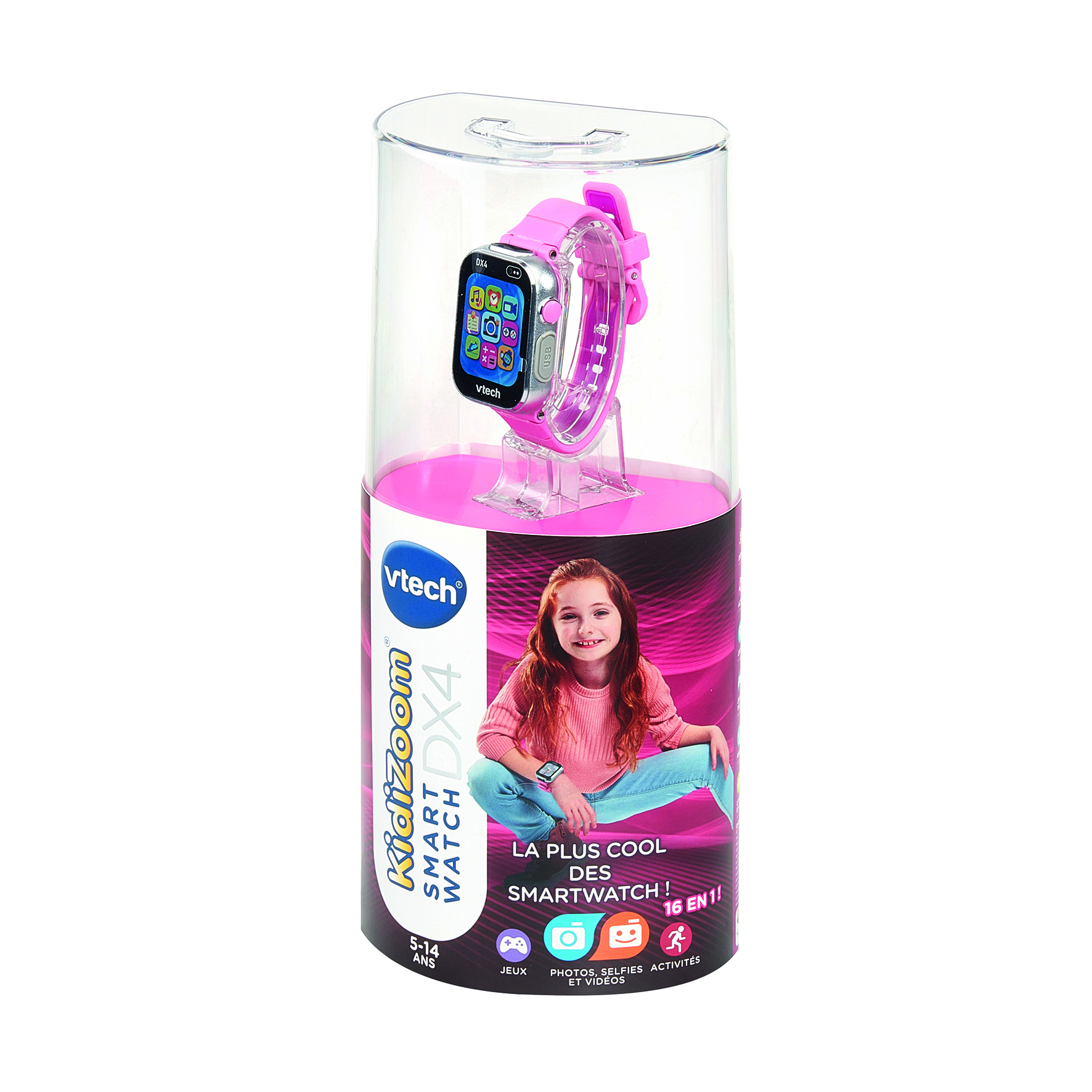 KidiZoom® Smartwatch DX4 rose est conçue pour les enfants de 5 à 14 ans. Elle regroupe 16 fonctions ludiques et éducatives pour éveiller la curiosité, développer la créativité et apprendre à gérer son temps.