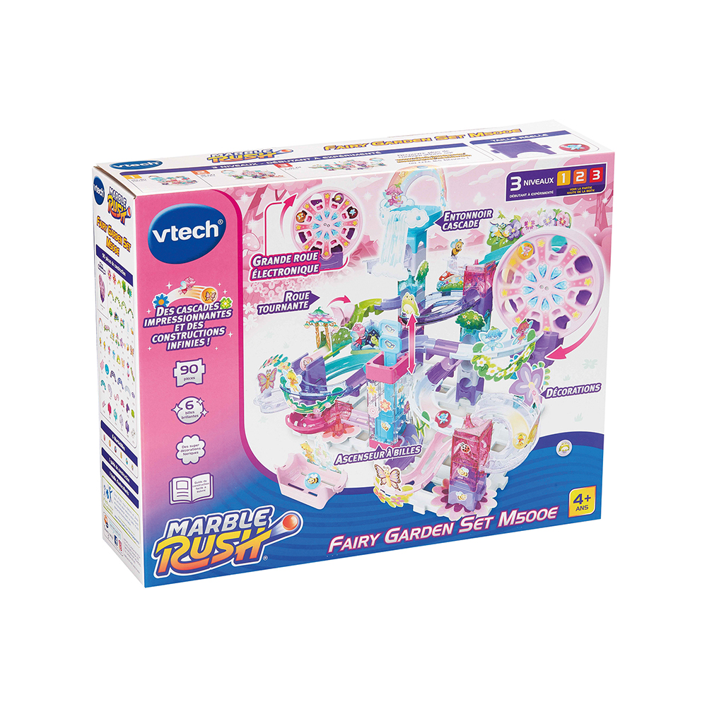Le Fairy Garden Set M500E est un circuit à billes féerique et coloré à construire soi-même, conçu pour les enfants dès 4 ans. Ce coffret fait partie de l’univers Marble Rush® et propose une expérience de jeu immersive avec des cascades, des virages, une grande roue électronique et des accessoires sur le thème de la nature.