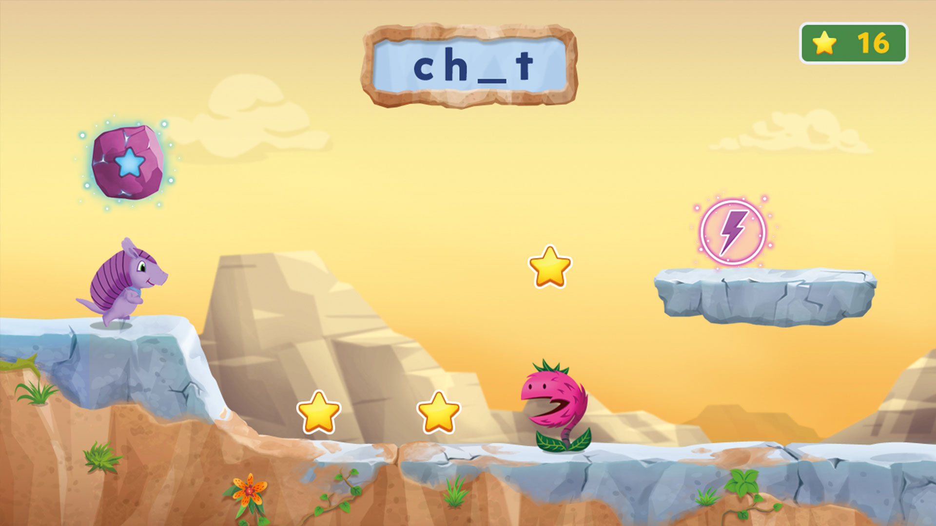 Saute pour récupérer les étoiles, accroupis-toi pour éviter les obstacles et complète les mots