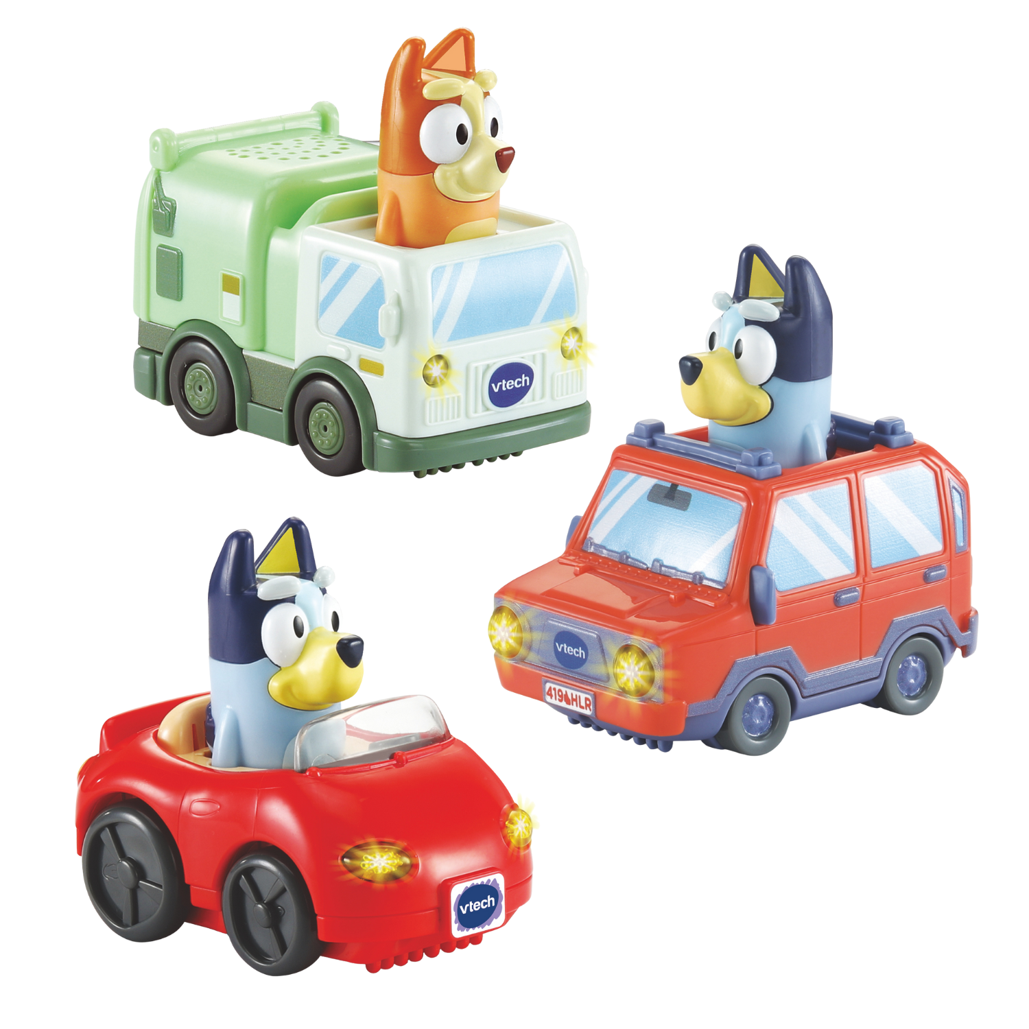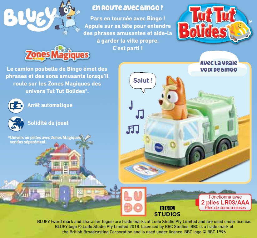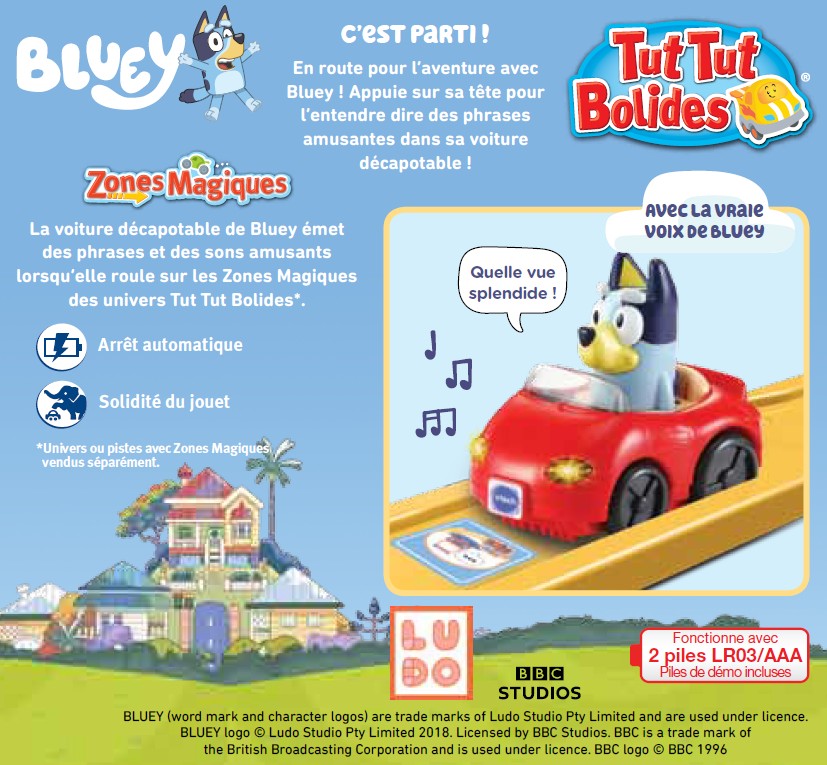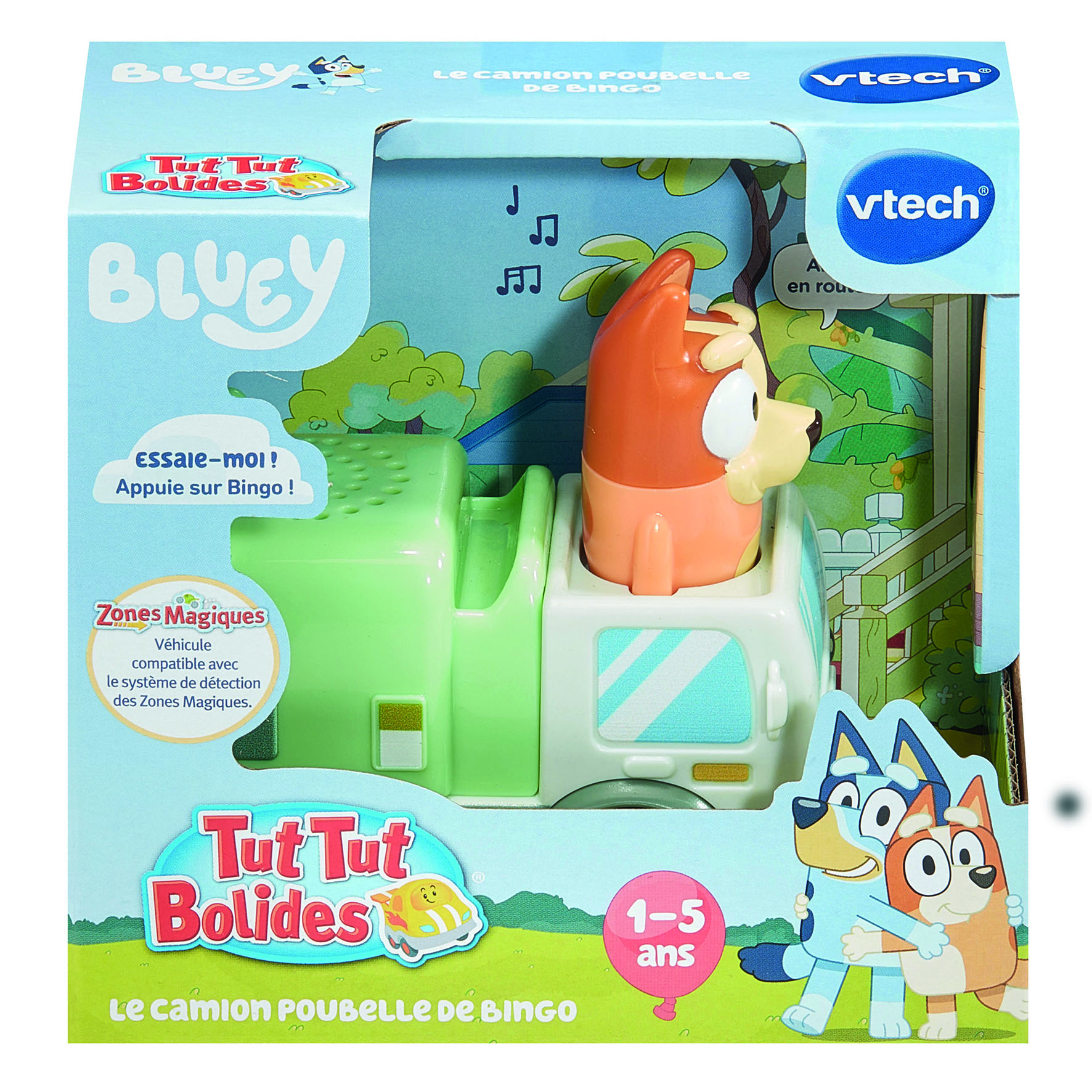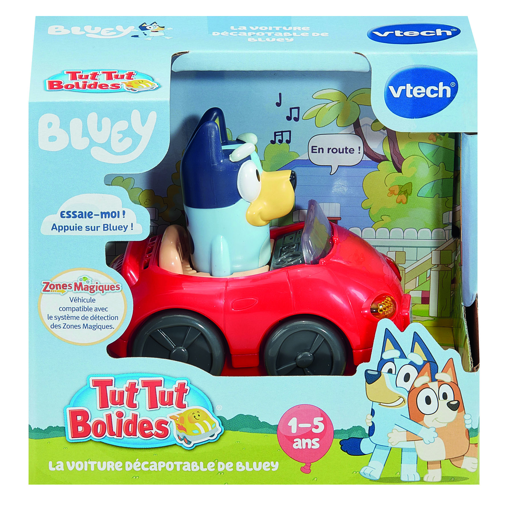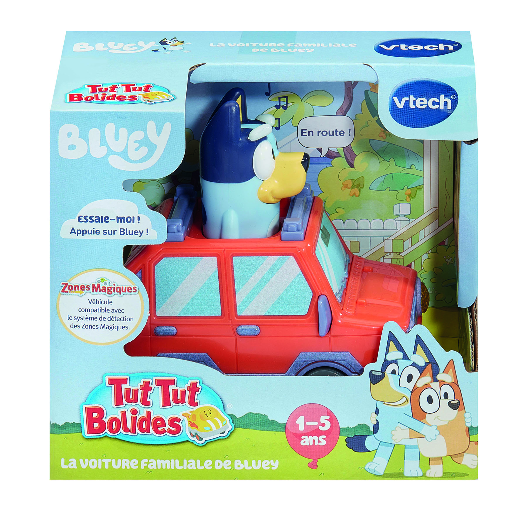 Les Tut Tut Bolides Bluey sont des véhicules interactifs qui permettent aux enfants dès 1 an de retrouver leurs personnages préférés à travers trois modèles différents : la voiture décapotable de Bluey, sa voiture familiale et le camion poubelle de Bingo.