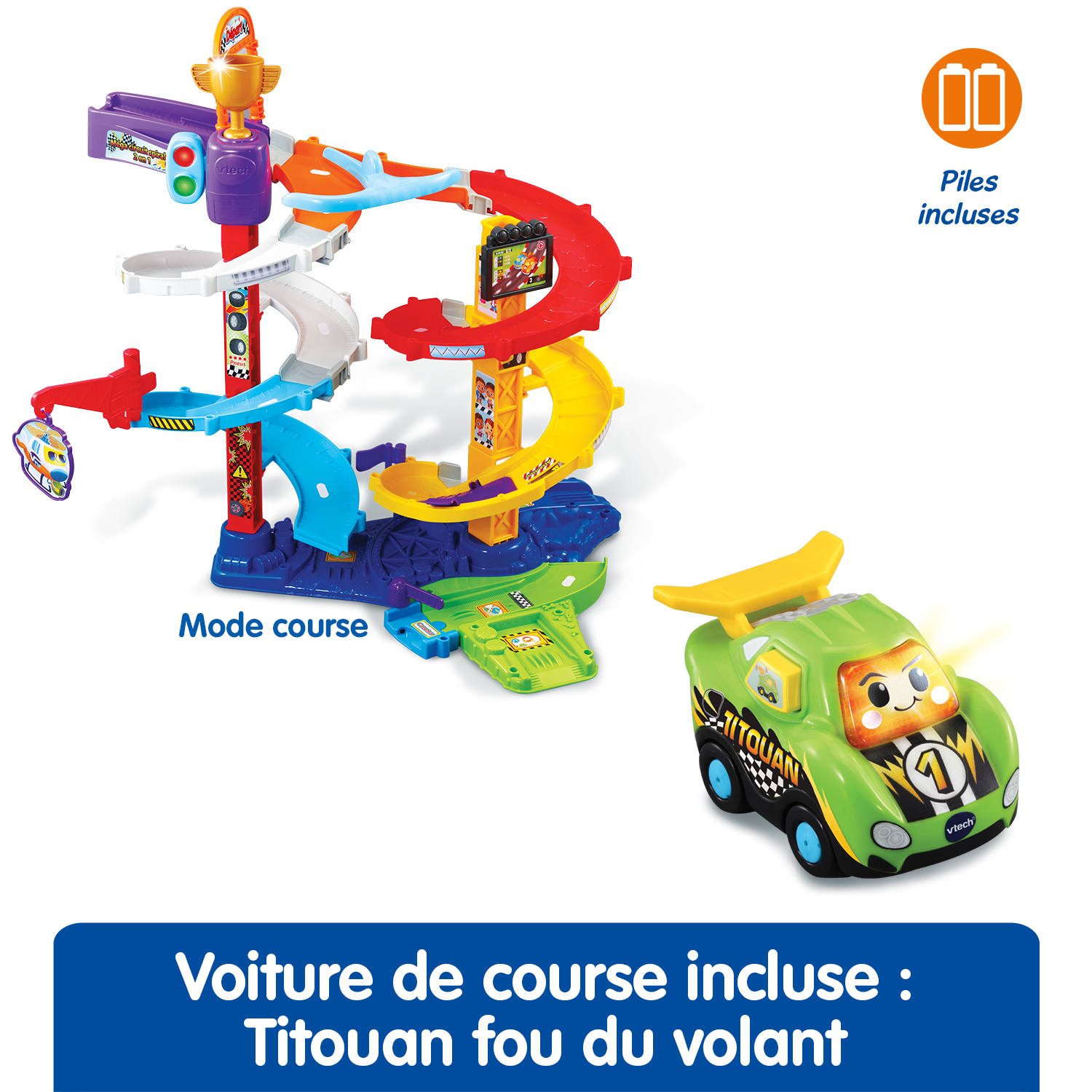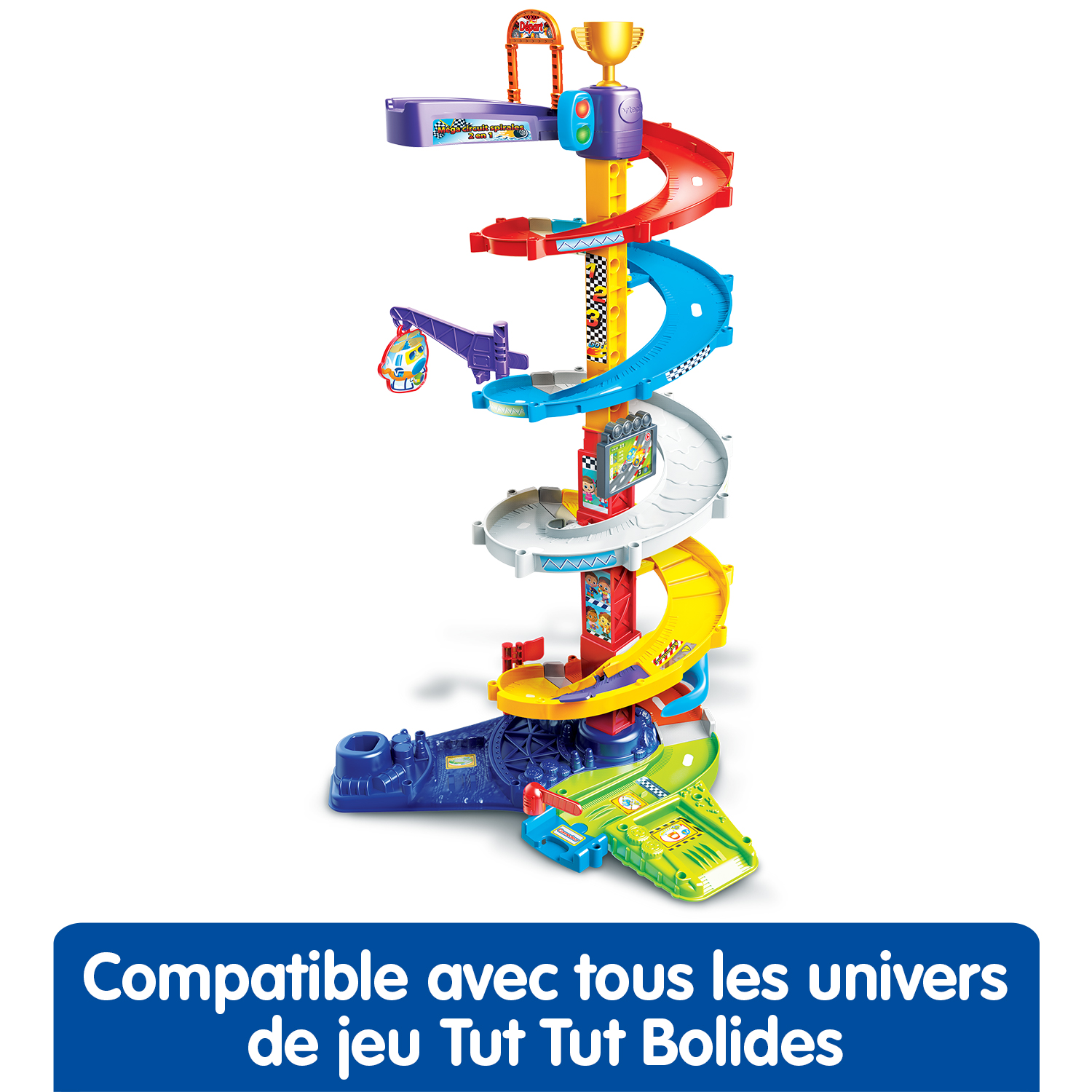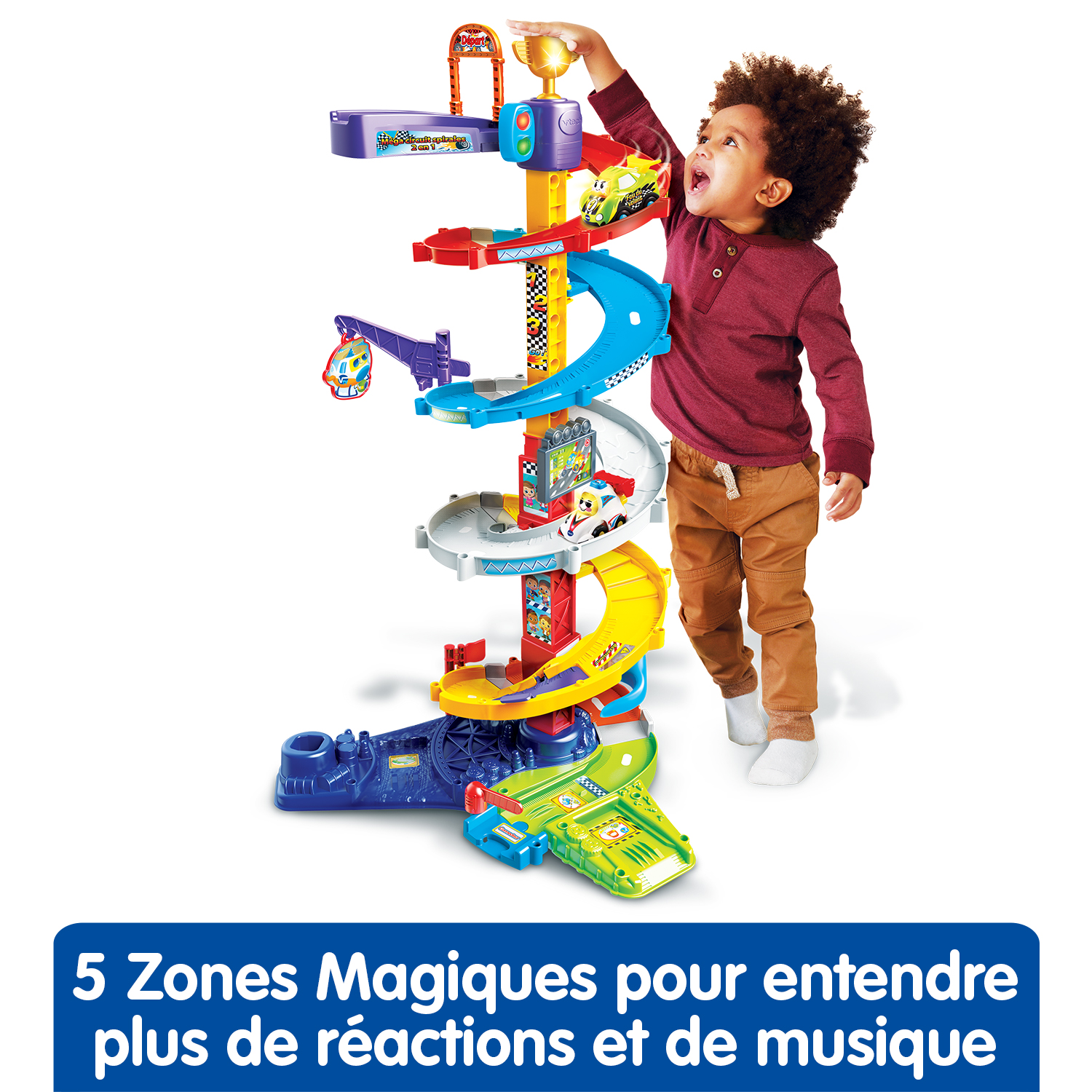 Placer Titouan, fou du volant sur le lanceur pour le voir s’élancer sur le Méga circuit spirales 2 en 1 permet de développer la motricité de votre enfant.