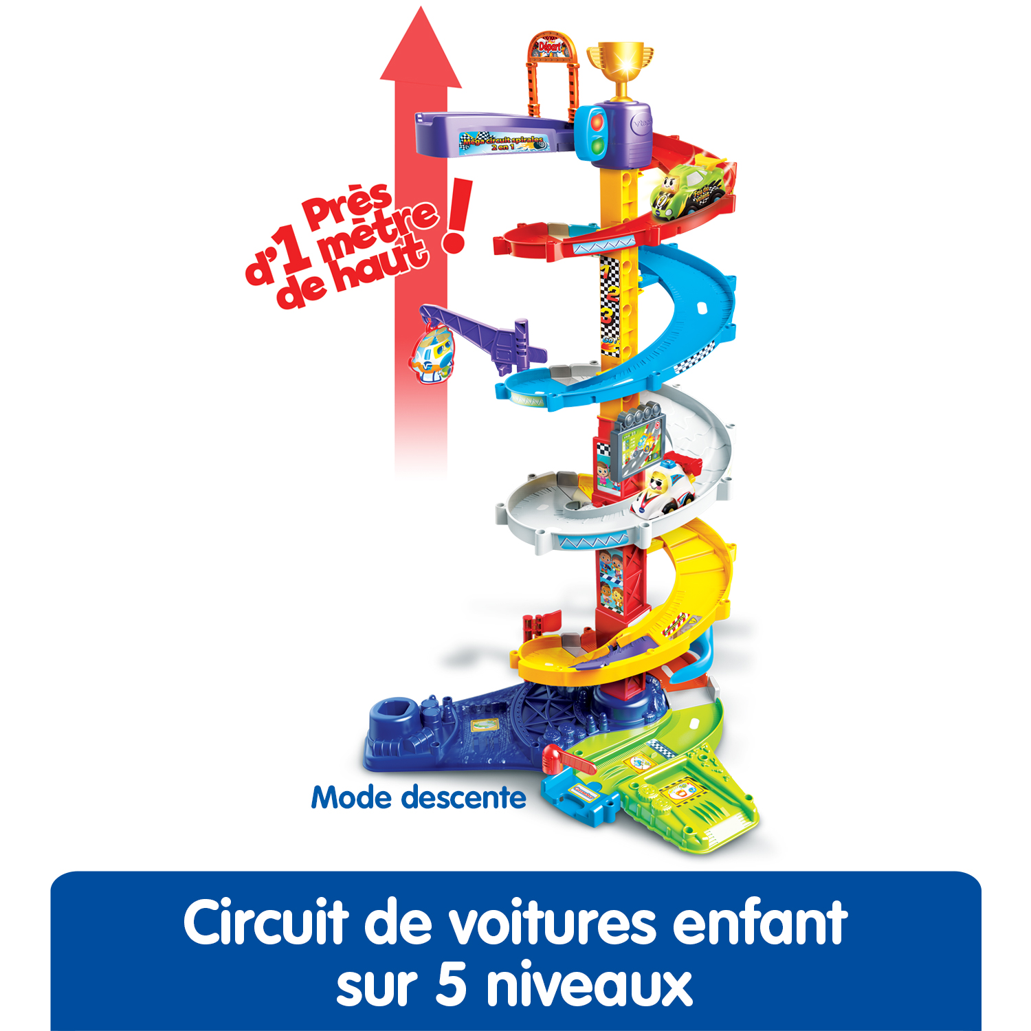 92 cm de hauteur ! En mode descente, l’enfant appuie sur le feu tricolore pour faire descendre les véhicules. Trop rigolo ! Des passages secrets permettent de descendre plus rapidement !