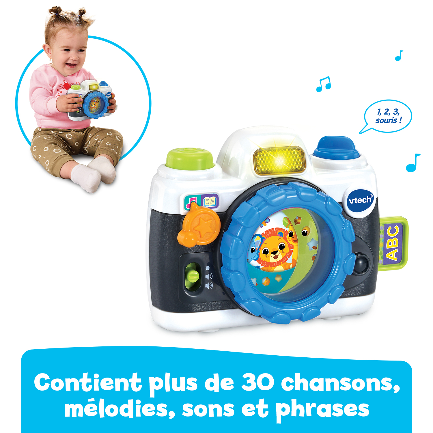 Facile à prendre en main, ce jouet en forme d’appareil photo propose 2 modes de jeu (Musique et Découverte) et encourage l’enfant à tourner l’objectif, appuyer sur le déclencheur ou encore faire glisser une fausse carte SD pour déclencher des interactions sonores et lumineuses.