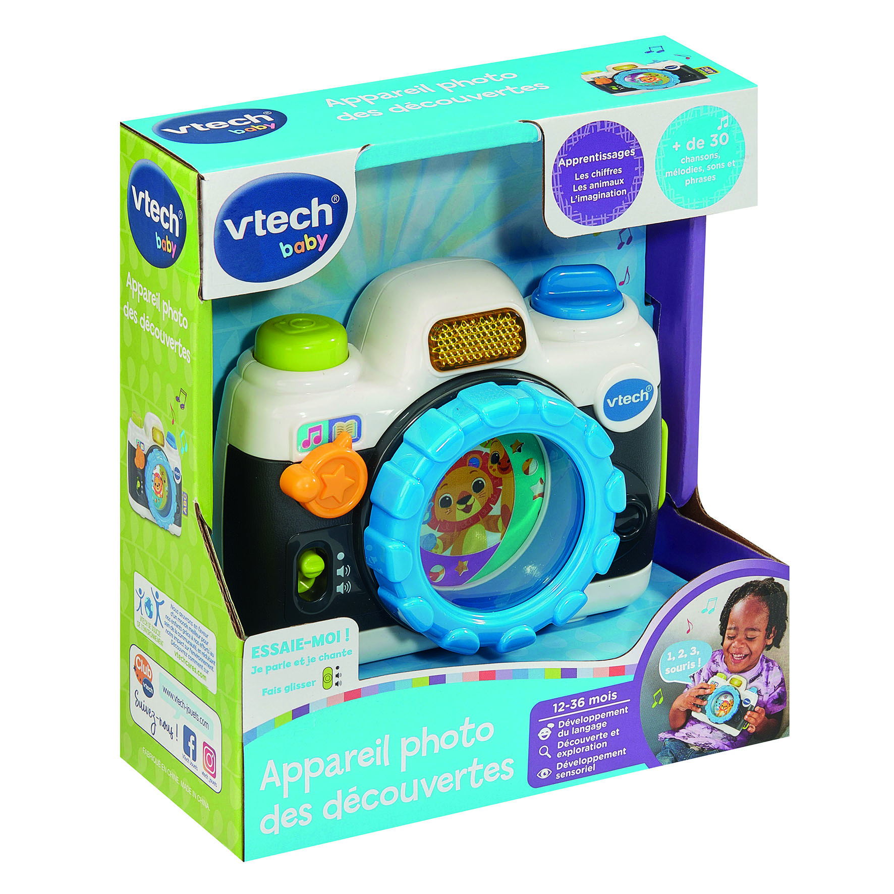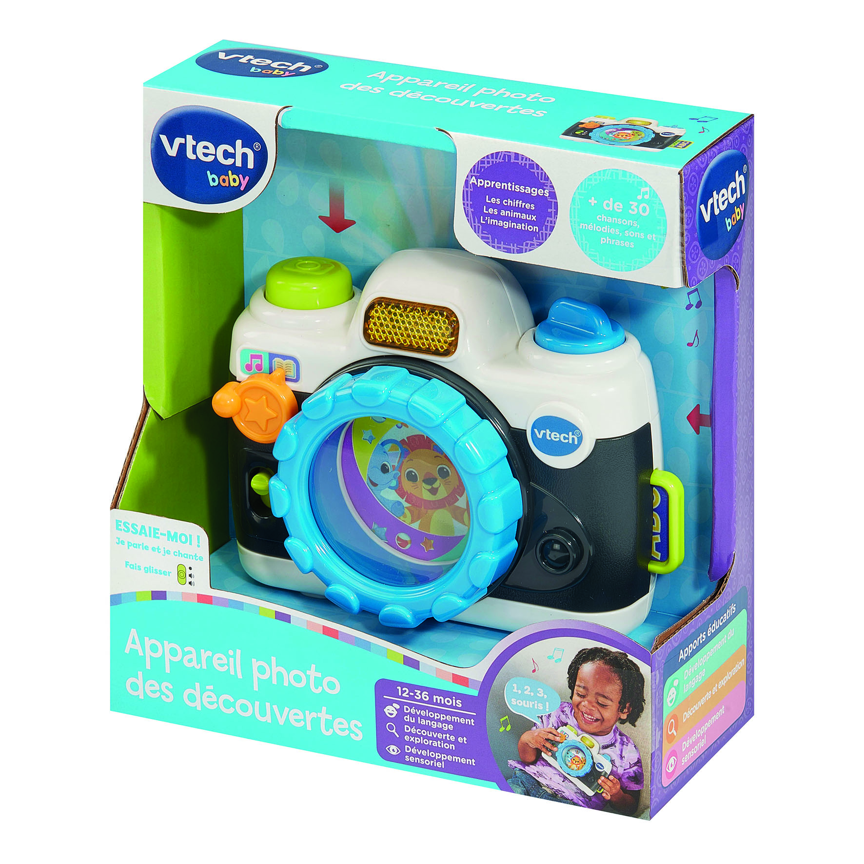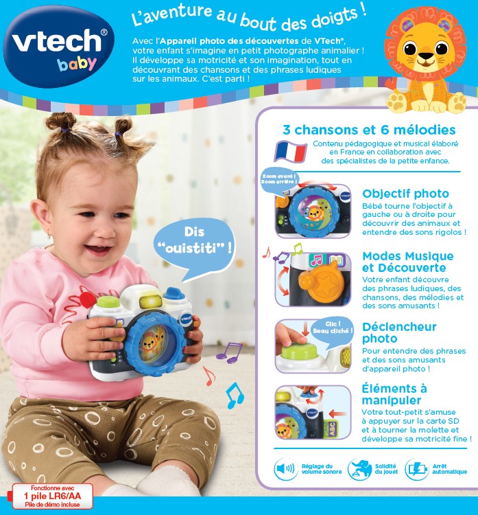 L’Appareil photo des découvertes est un jouet d’éveil interactif conçu pour les tout-petits dès 12 mois. Pensé comme un véritable appareil photo jouet, il invite l’enfant à faire semblant de photographier les animaux tout en découvrant des sons amusants, des chansons et des phrases éducatives.