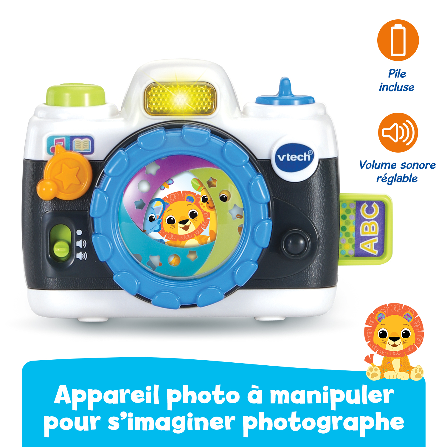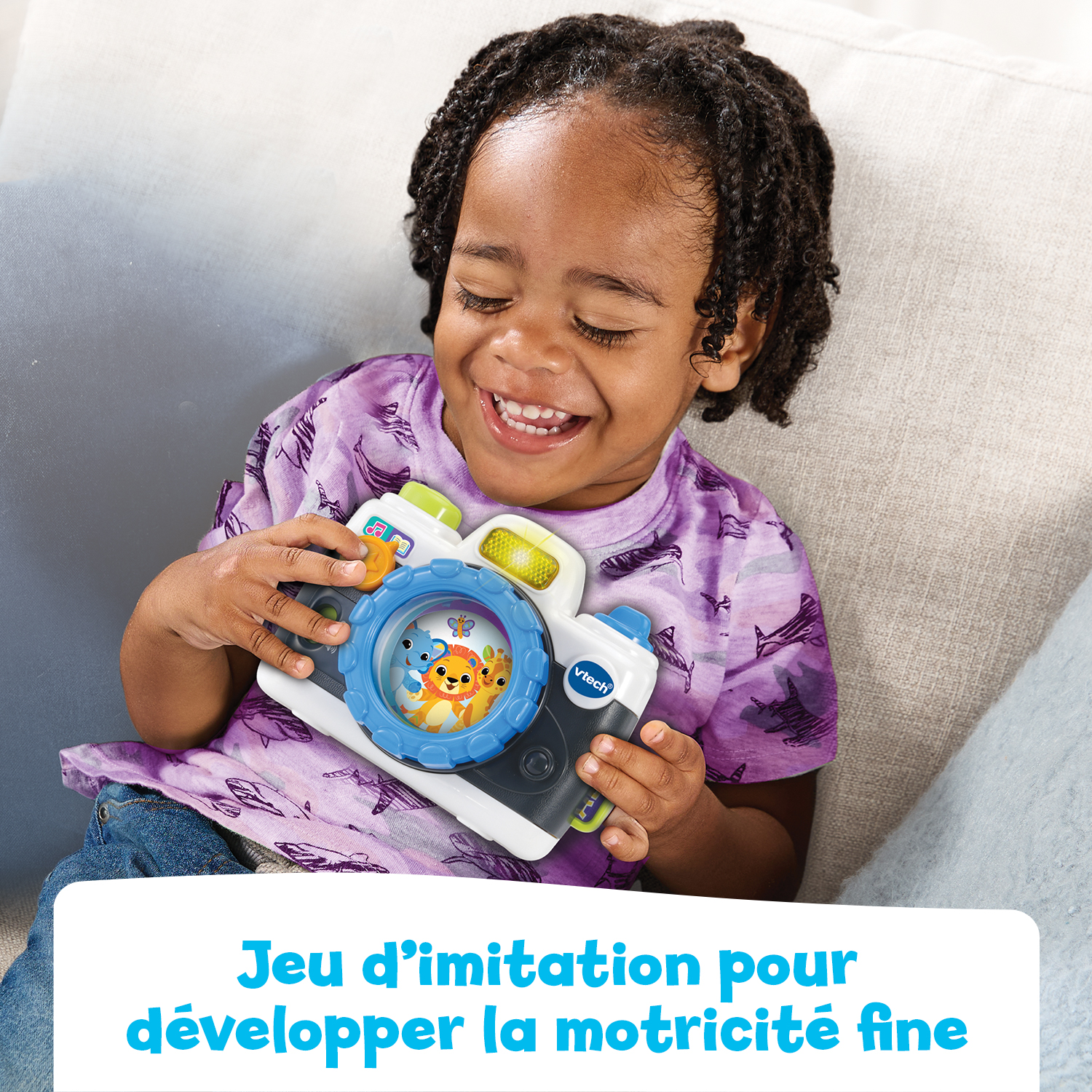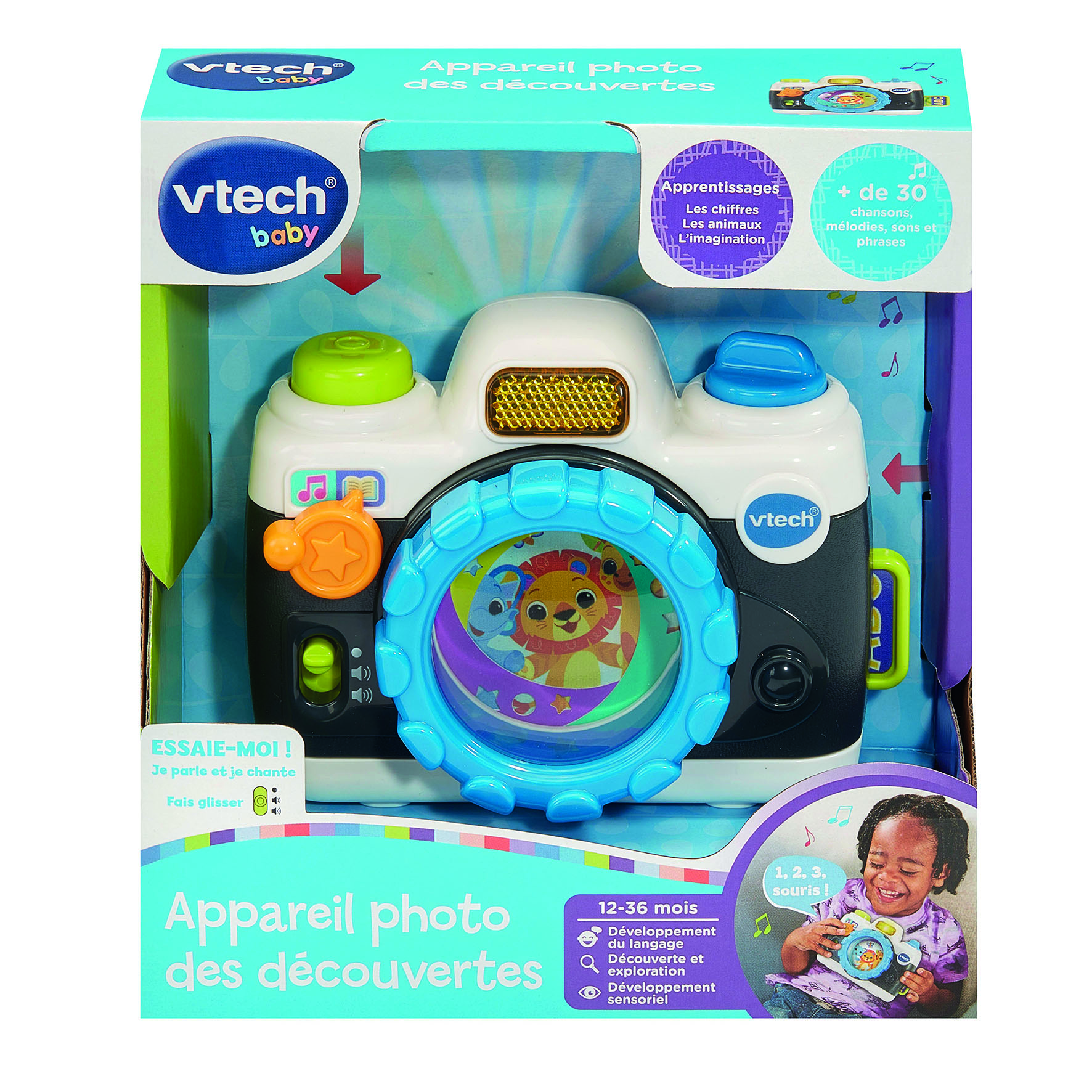 L’Appareil photo des découvertes est un jouet d’éveil interactif conçu pour les tout-petits dès 12 mois. Pensé comme un véritable appareil photo jouet, il invite l’enfant à faire semblant de photographier les animaux tout en découvrant des sons amusants, des chansons et des phrases éducatives.