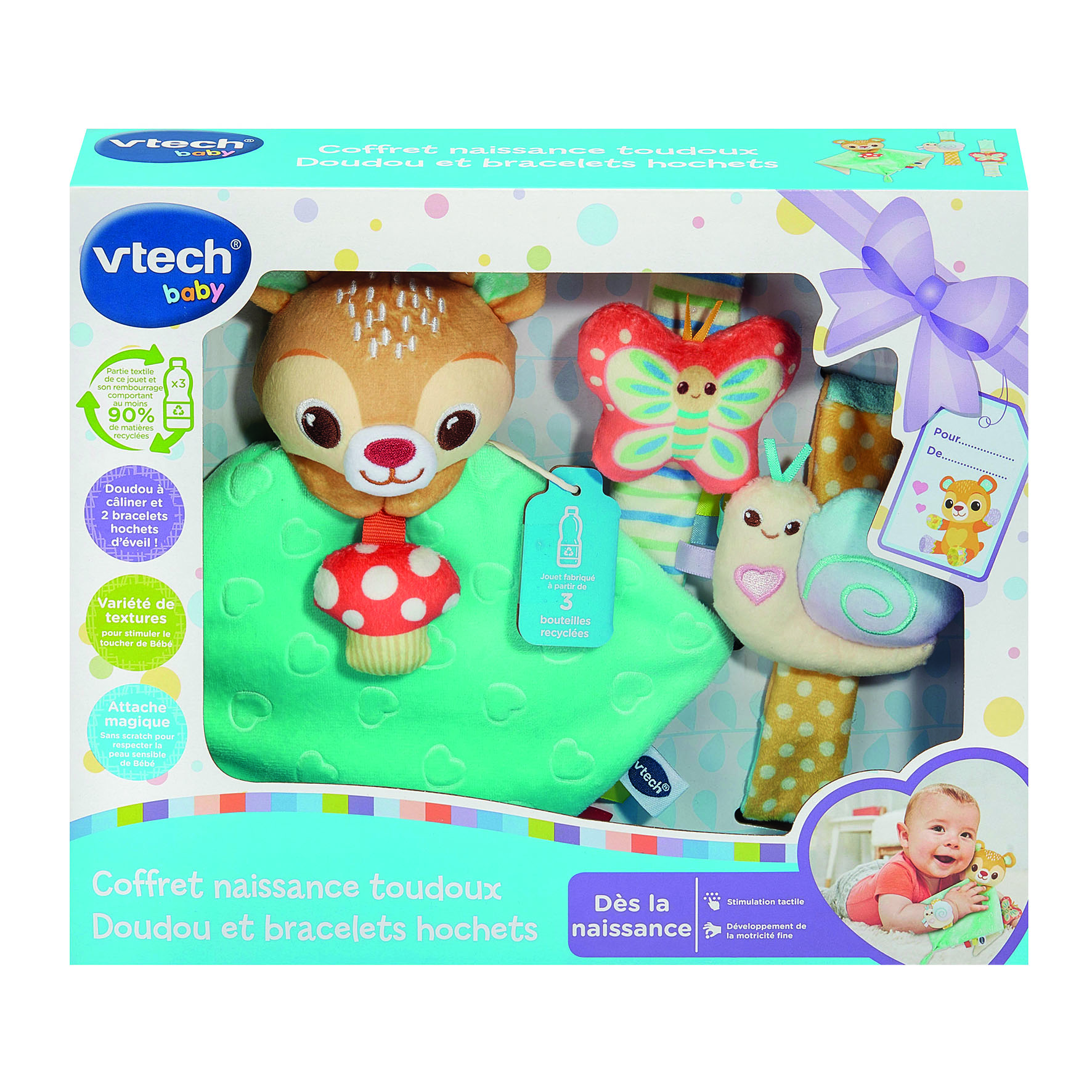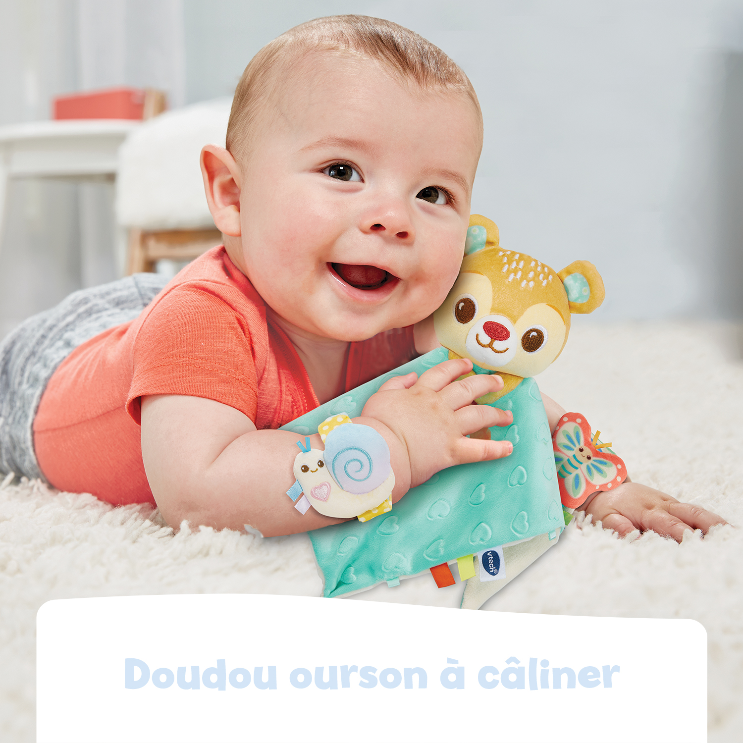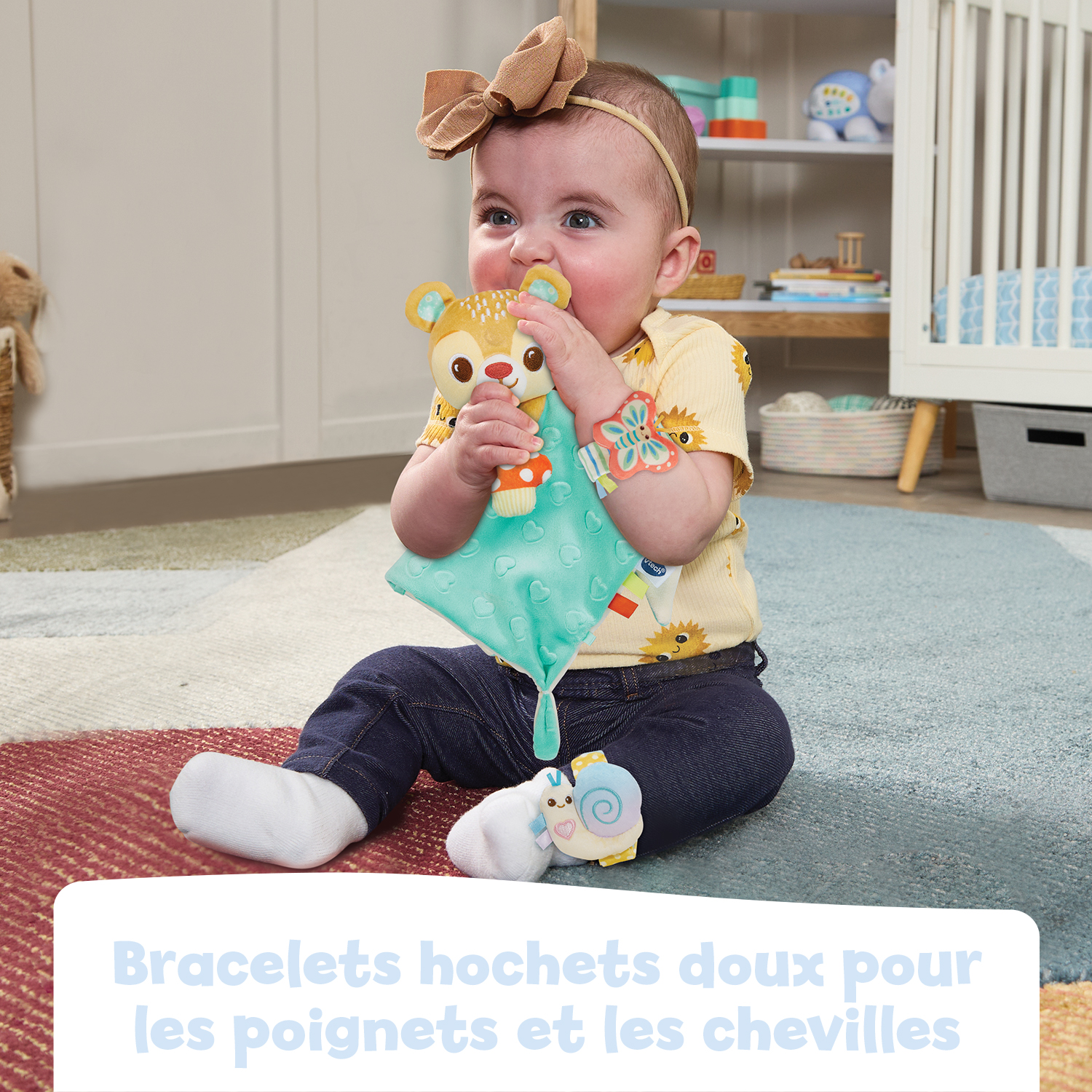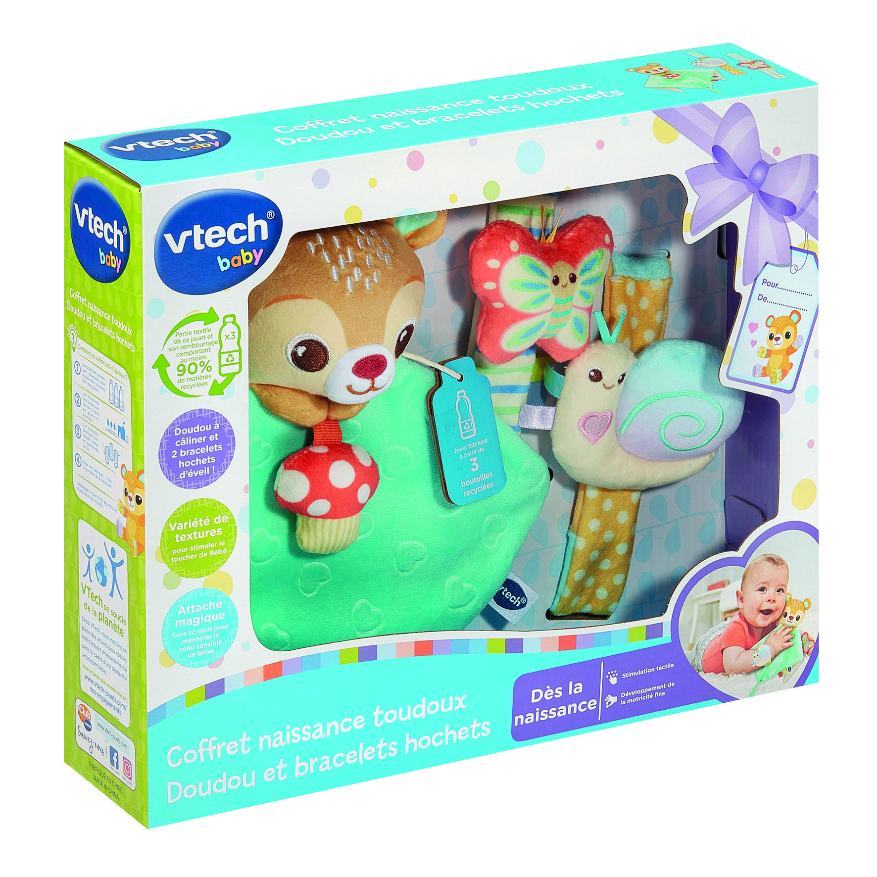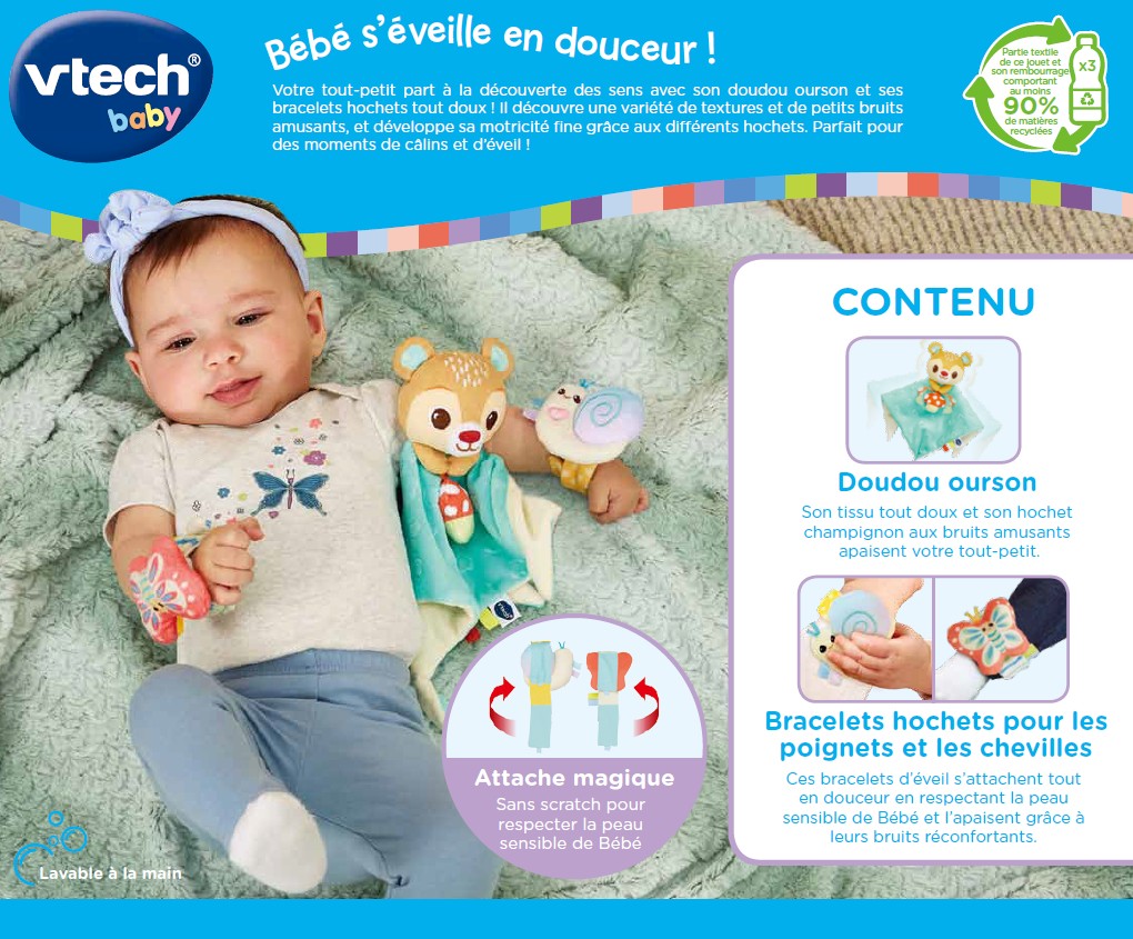 Dès la naissance, ce coffret naissance accompagne les tout-petits dans leurs premiers instants d’éveil et de tendresse. Il comprend un doudou ourson à câliner et 2 bracelets hochets à attacher aux poignets ou aux chevilles de Bébé pour stimuler ses sens en douceur. Grâce à ses textures variées et ses petits bruits amusants, ce coffret est idéal pour favoriser l’exploration sensorielle et le développement de la motricité fine dès les premiers mois.