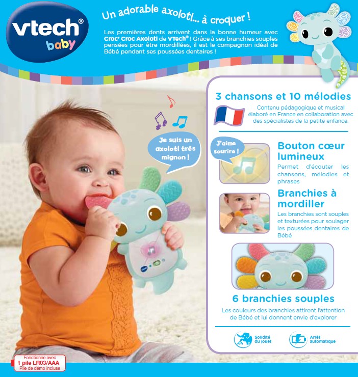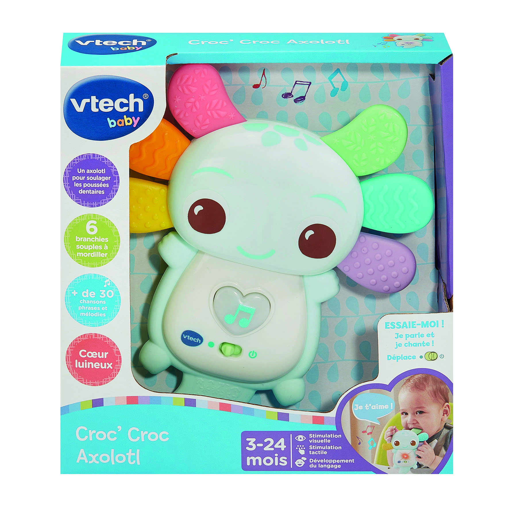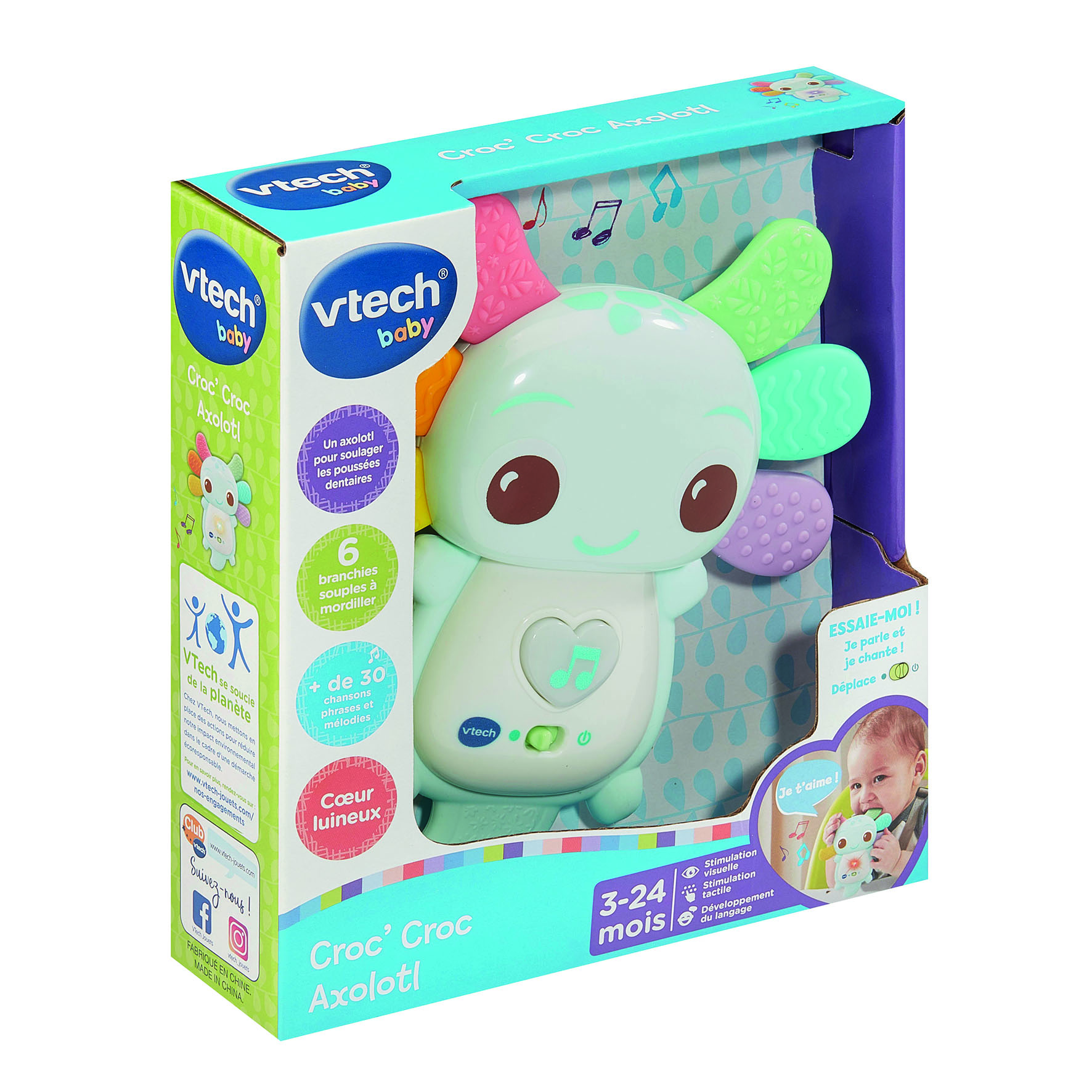 Croc’ Croc Axolotl est un jouet premier âge conçu pour accompagner les tout-petits dès 3 mois dans leurs découvertes sensorielles et leurs poussées dentaires. Avec son design tendre et coloré en forme d’axolotl, cet adorable compagnon apaise Bébé grâce à ses branchies texturées à mordiller.