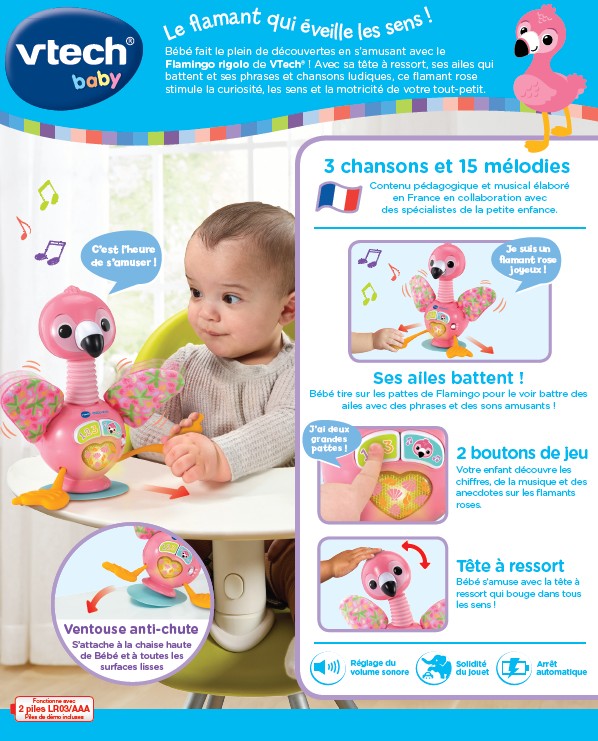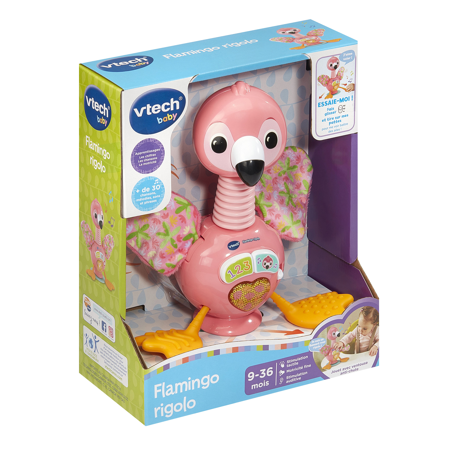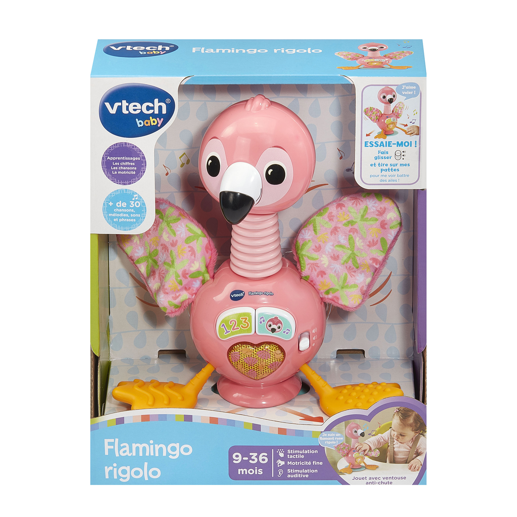 Flamingo rigolo est un flamant rose interactif et coloré conçu pour divertir et stimuler les bébés dès 9 mois. Grâce à sa tête montée sur ressort, ses ailes animées, ses sons amusants et ses chansons entraînantes, ce flamant rose accompagne les tout-petits dans leurs premières découvertes sensorielles et motrices.