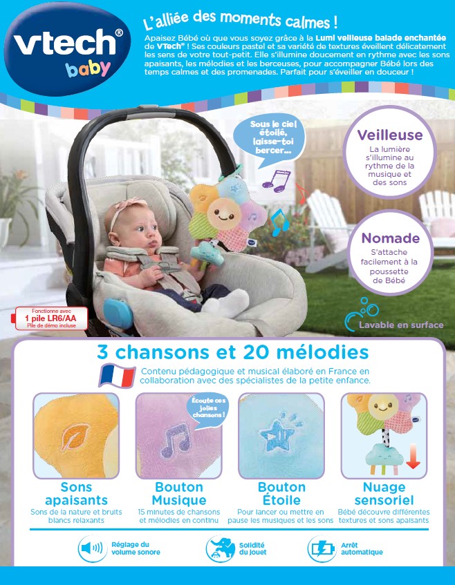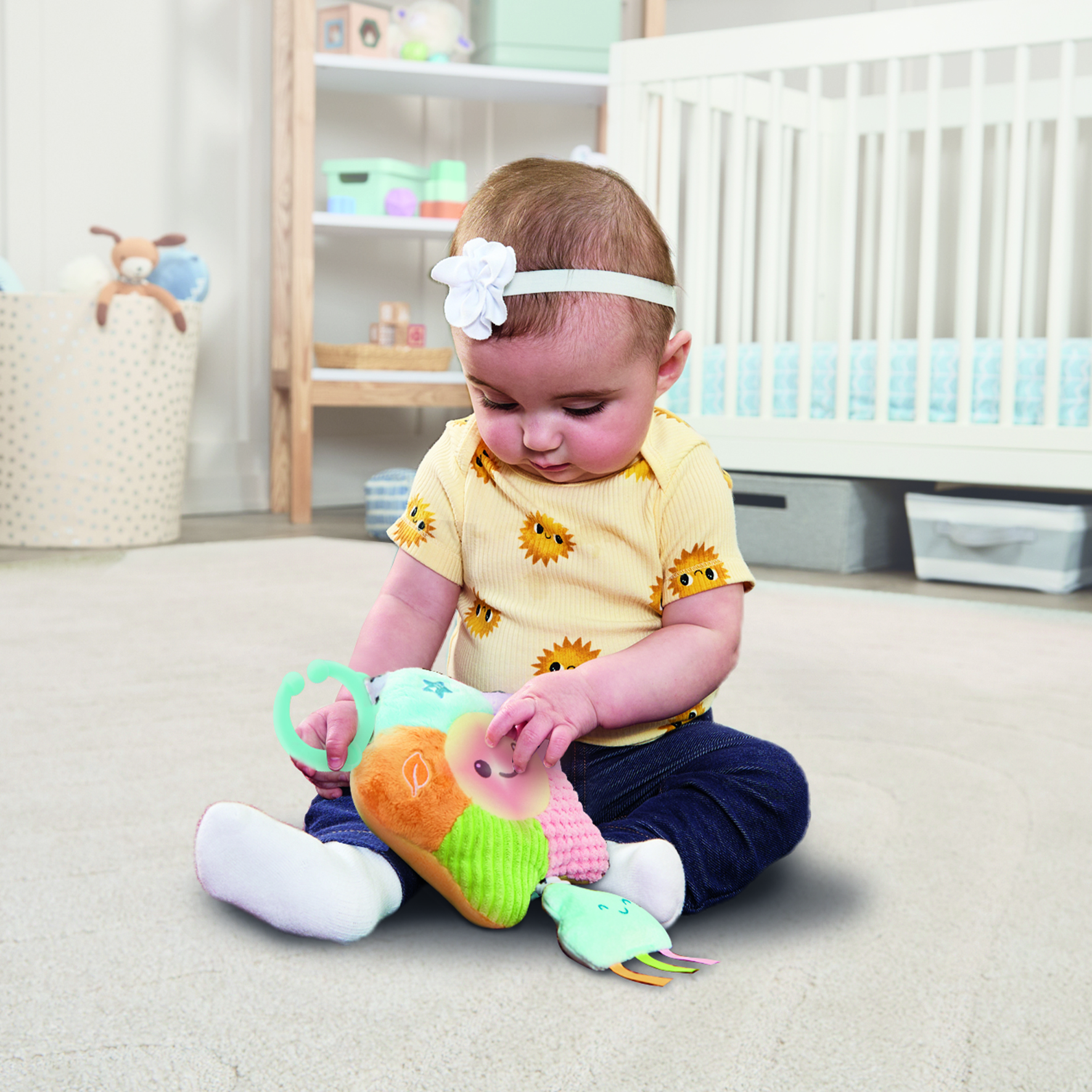 Facile à accrocher à une poussette ou siège auto grâce à son attache intégrée, elle se transporte partout. En plus de sa fonction veilleuse, elle stimule en douceur les sens de Bébé grâce à ses différentes textures et ses boutons interactifs.