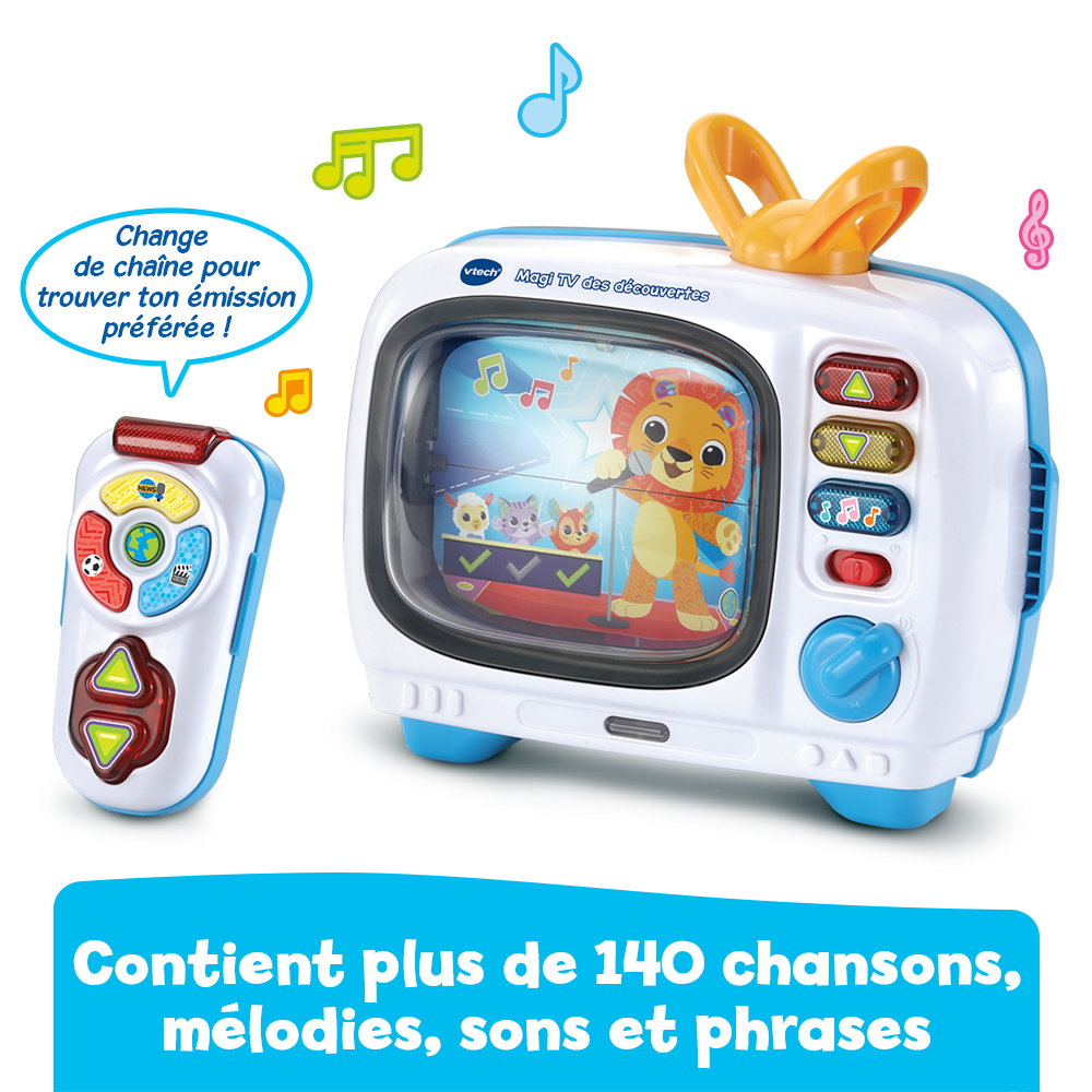 La Magi TV des découvertes est une télévision interactive et musicale conçue pour les enfants de 12 à 36 mois, accompagnée d’une télécommande magique pour zapper comme les grands. Ce jouet éducatif propose 10 chaînes thématiques, dont 5 bilingues (français/anglais), avec des programmes variés autour des animaux, de la météo, de la cuisine, du sport ou encore de la musique.