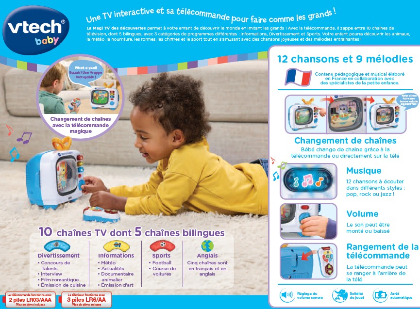 Chaque changement de chaîne déclenche des animations sonores, des chansons, des effets lumineux et des phrases éducatives qui stimulent la curiosité de l’enfant. Grâce à la télécommande ou aux boutons de la télévision, l’enfant choisit ses programmes préférés tout en développant sa motricité et en découvrant de nouveaux mots. La musique et les effets lumineux apportent un côté festif à chaque session de jeu.