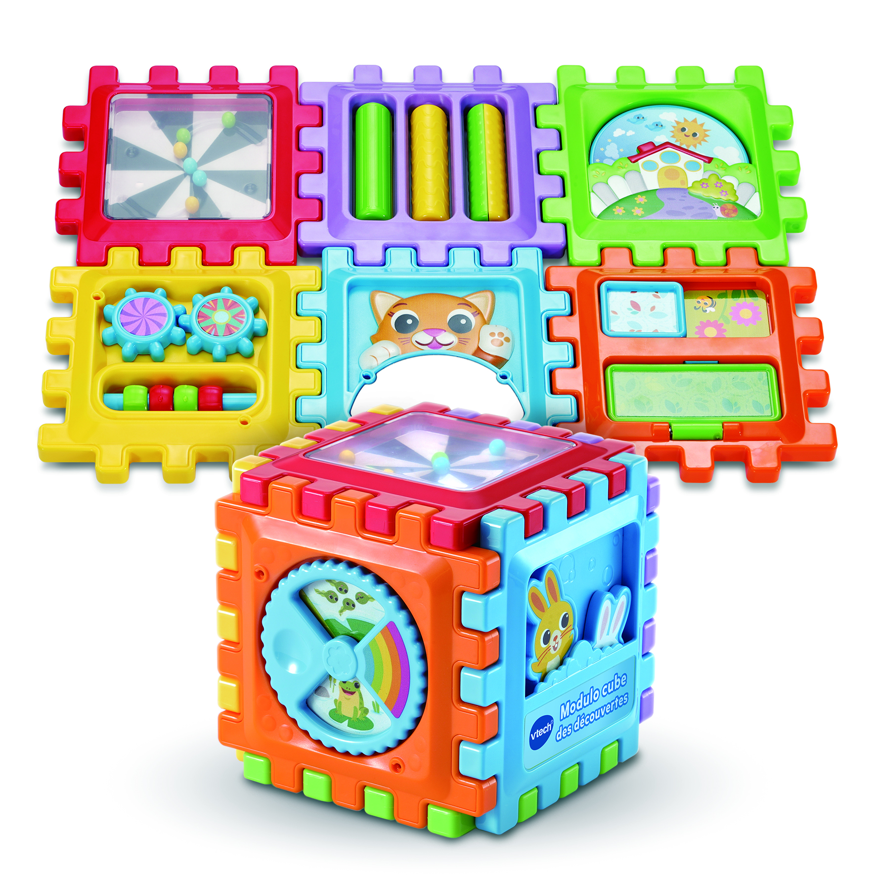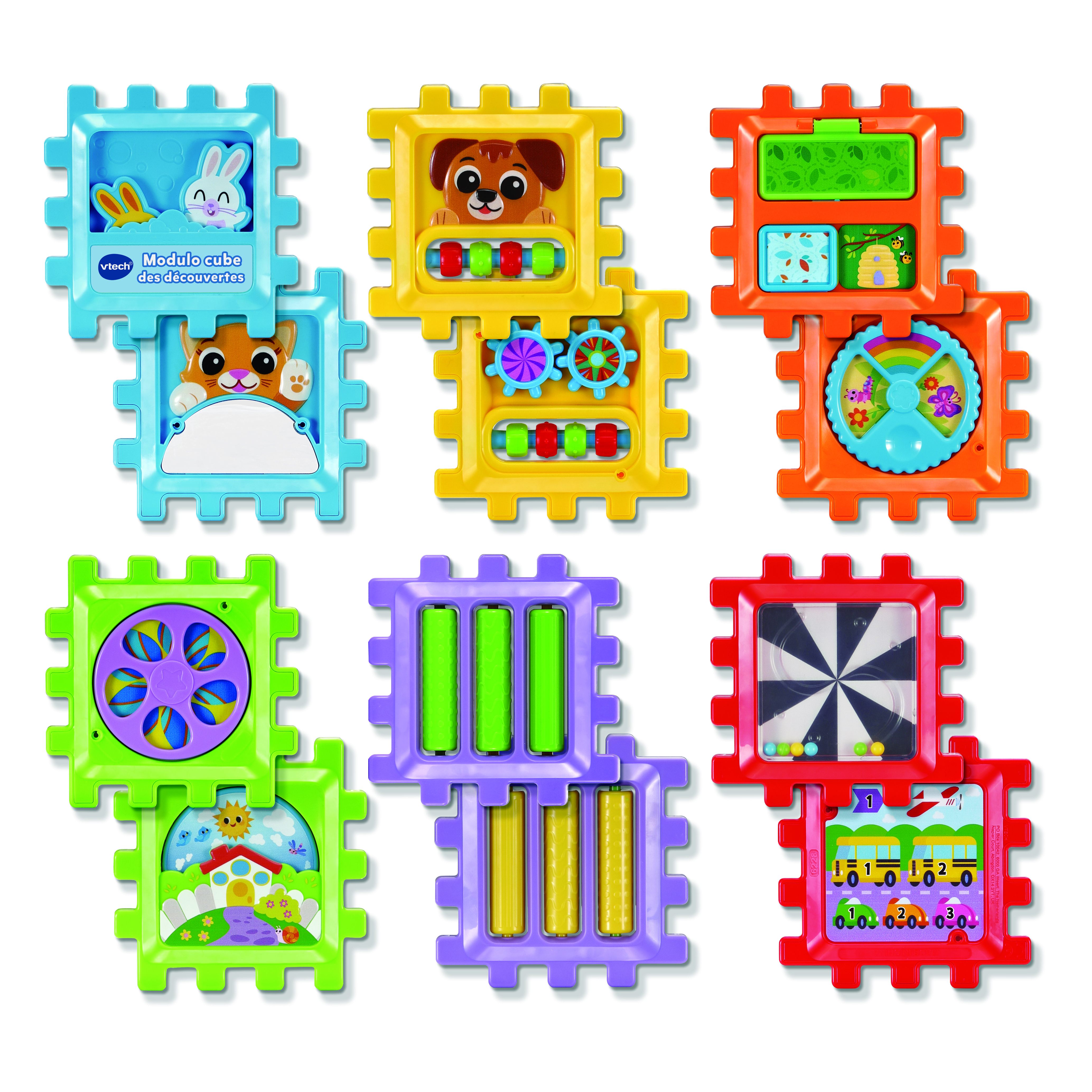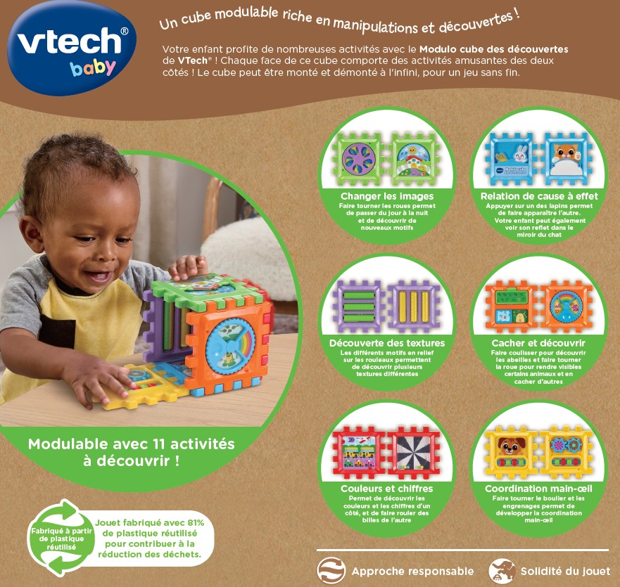 Conçu pour les enfants dès 12 mois, Modulo cube des découvertes est un cube d’activités évolutif, pensé pour éveiller la curiosité et stimuler le développement des tout-petits. Ce jouet est composé de 6 panneaux colorés à assembler et désassembler à volonté pour créer un cube, un plateau d’activités, ou même une petite maison.