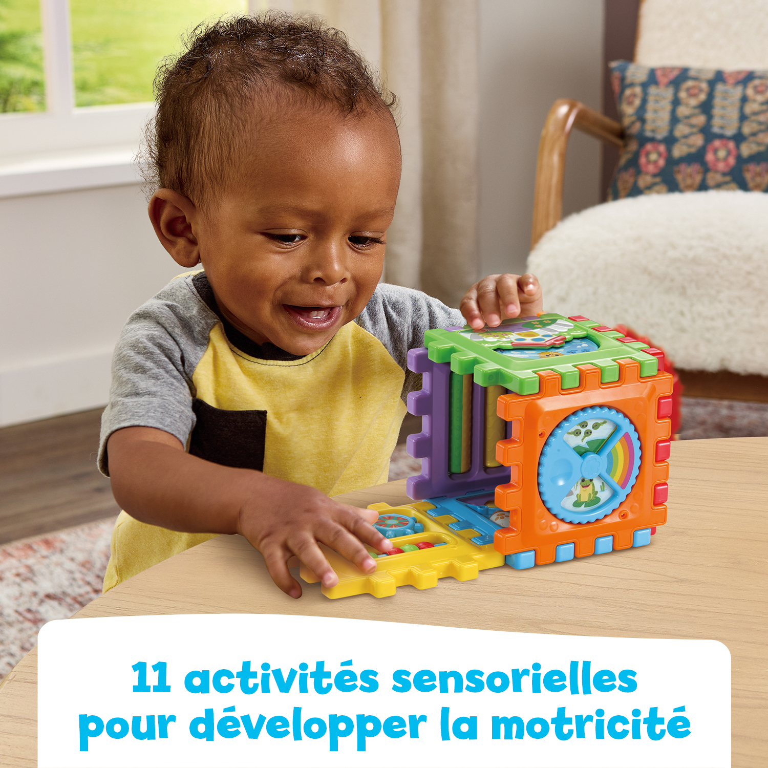 Un cube d’activités modulable avec 11 jeux sensoriels pour stimuler les tout-petits dès 12 mois.