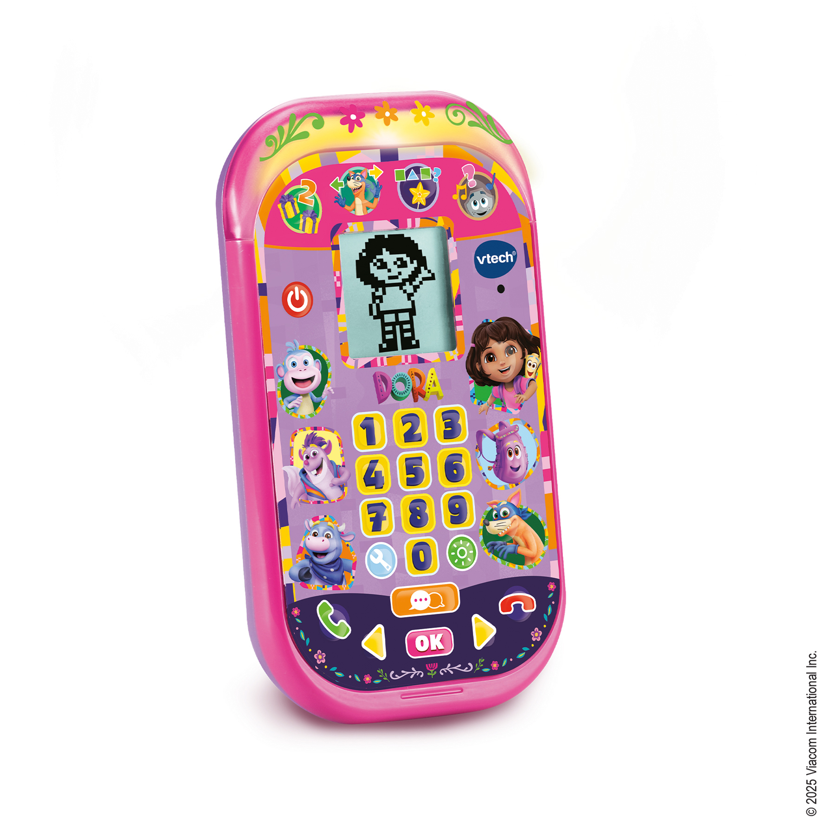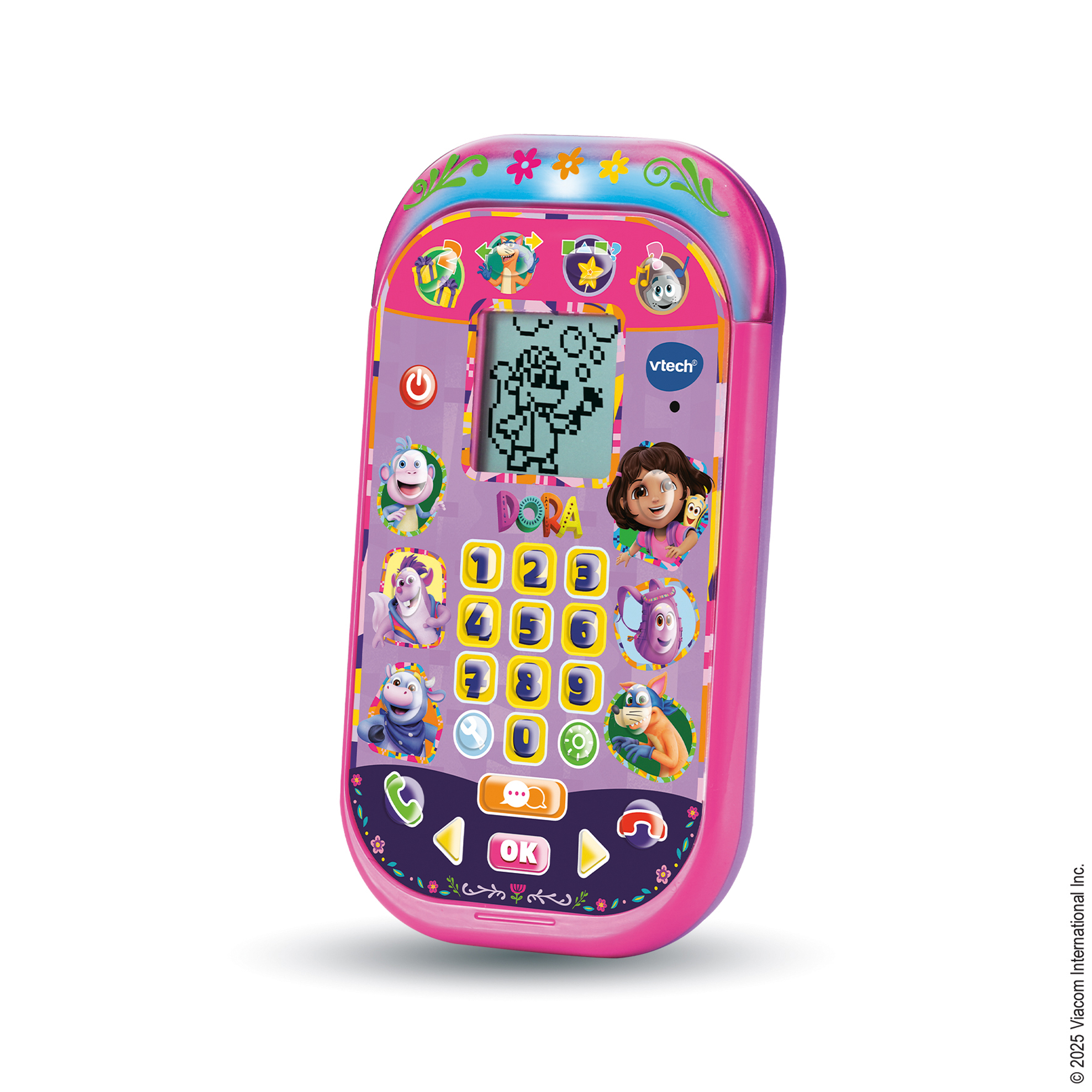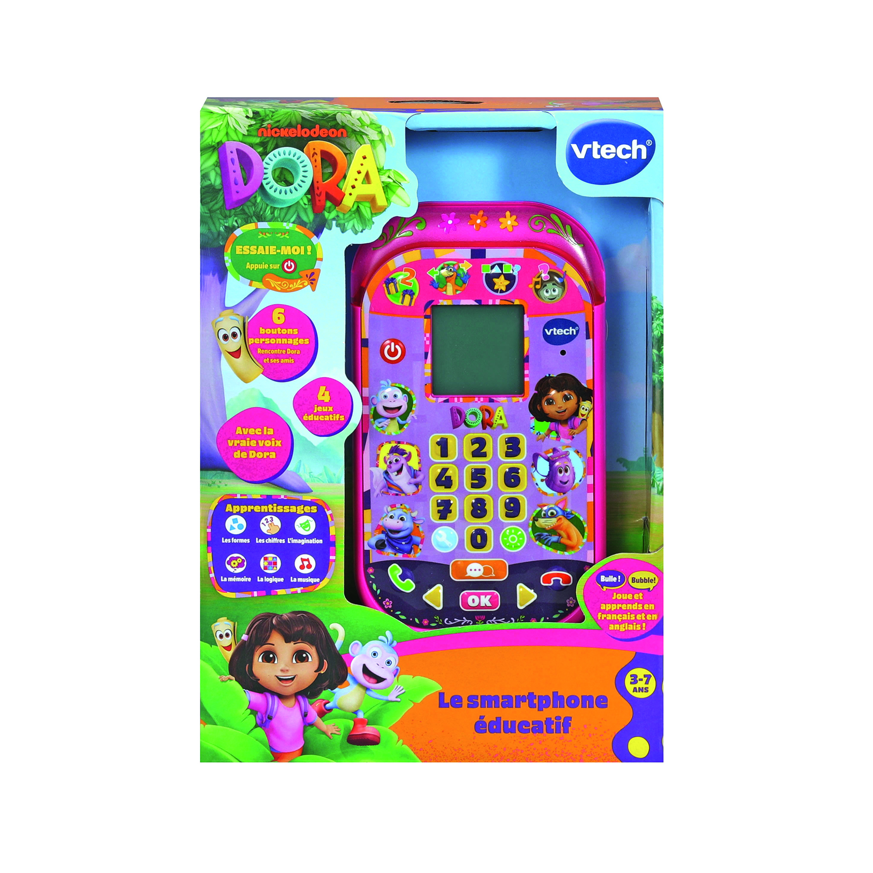 L’enfant apprend les chiffres, les formes, la logique, les directions ou encore les mélodies tout en jouant avec les personnages de l’univers de Dora. Il peut aussi simuler des appels, répondre à des messages et interagir avec des instructions sonores et visuelles, en français comme en anglais.