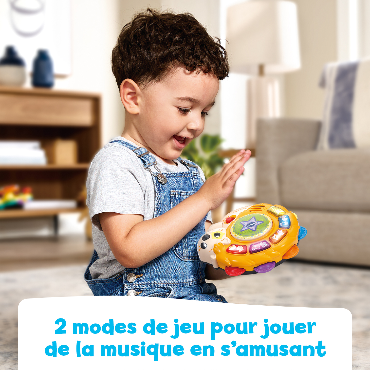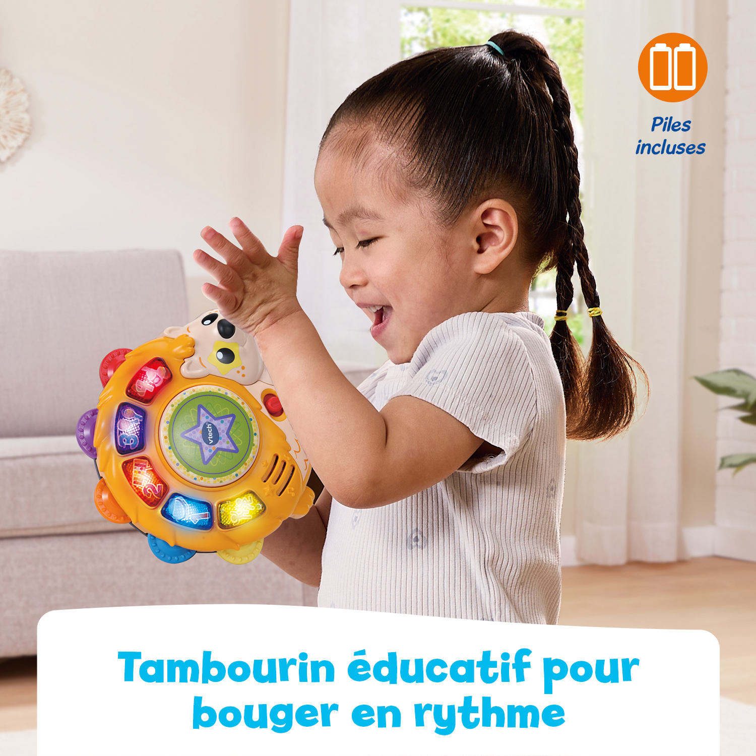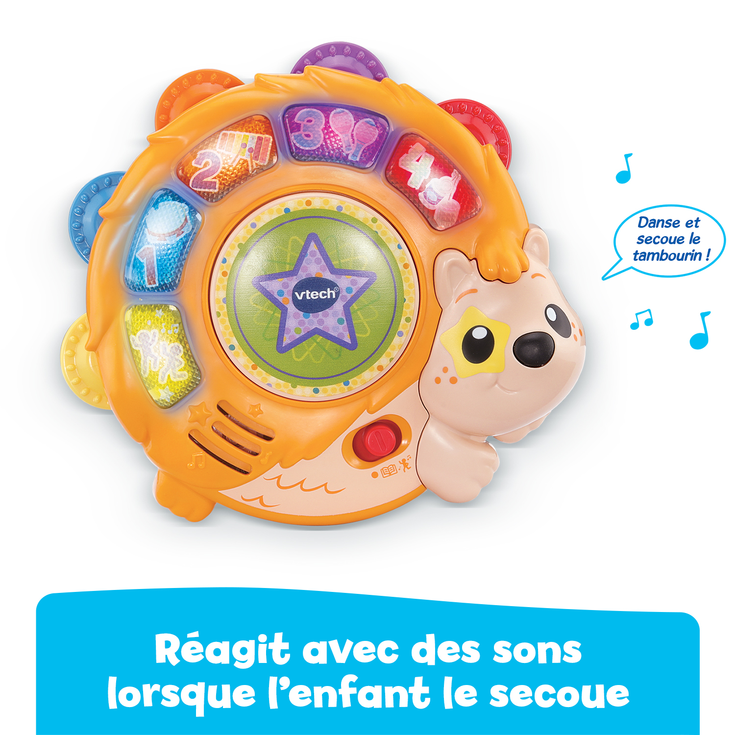 Facile à manipuler, ce tambourin réagit également aux mouvements : il suffit de le secouer pour déclencher des sons rigolos.