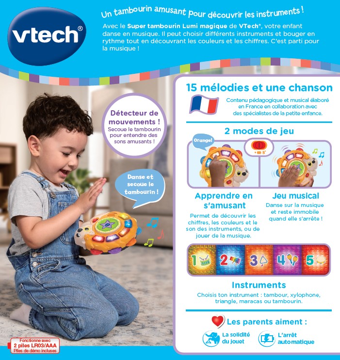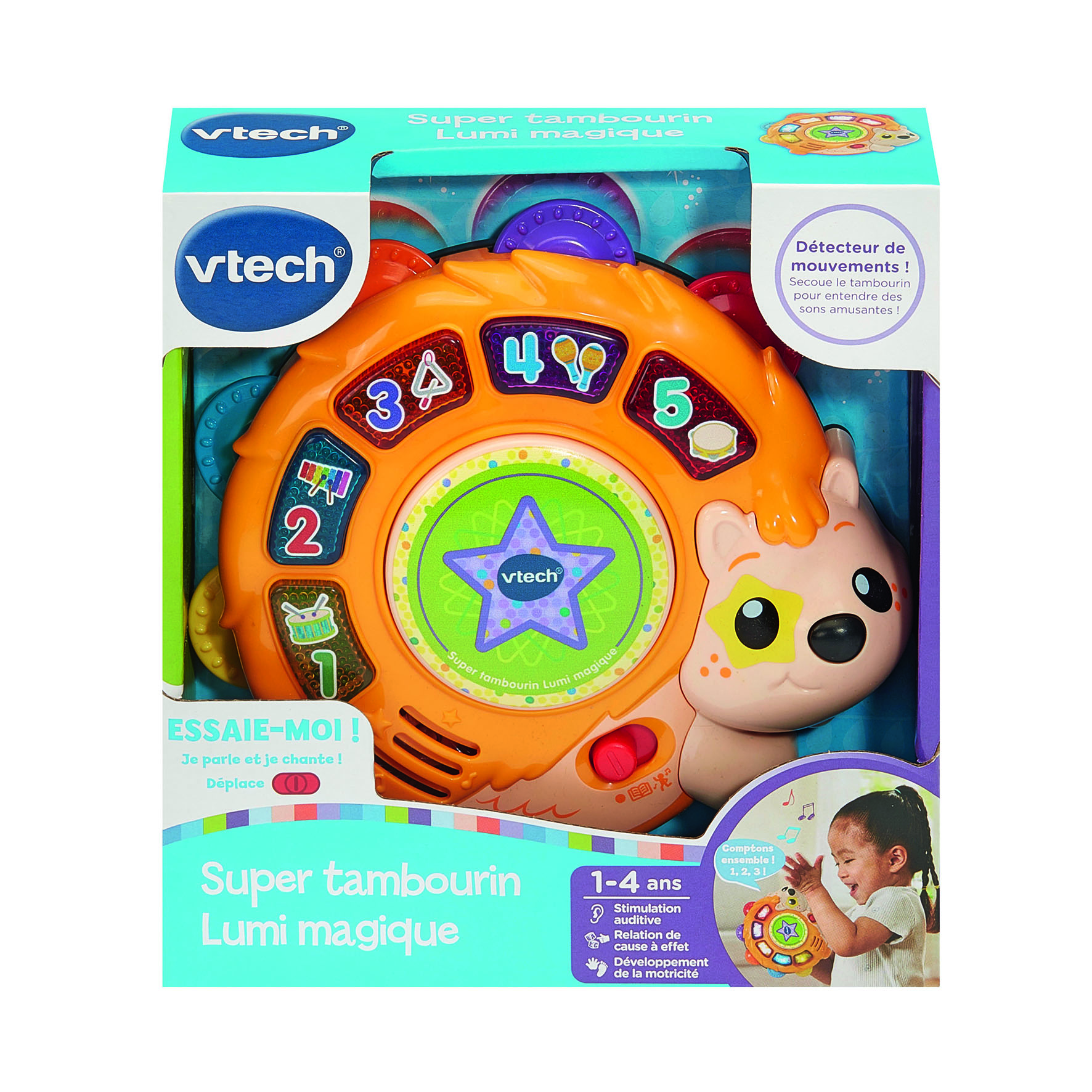 Ce Super tambourin Lumi magique est conçu pour initier les tout-petits aux instruments de musique (ce tambourin propose plusieurs instruments), aux chiffres et aux couleurs. Rigolo, en forme de hérisson, il propose 2 modes de jeu dynamiques.