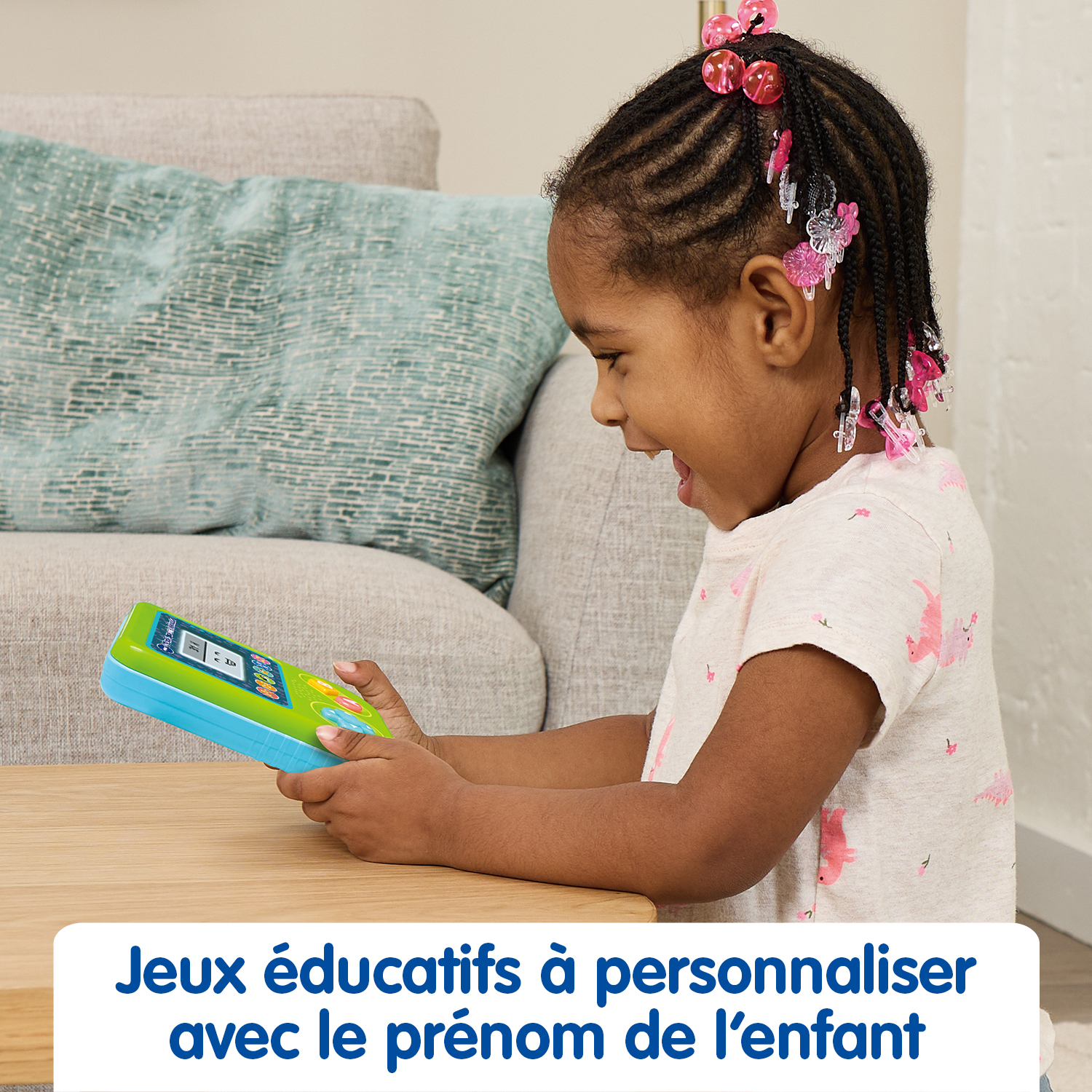 Une console éducative portable avec écran rétroéclairé et personnalisation du prénom pour une expérience unique dès 3 ans.