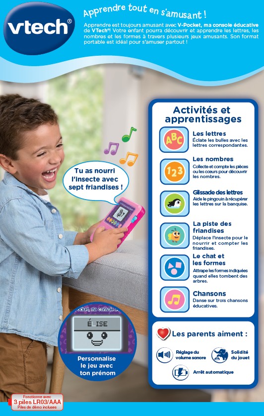 V-Pocket, ma console éducative, est une console interactive conçue pour apprendre en s’amusant, dès 3 ans. Compacte et facile à emporter partout, elle propose 6 jeux éducatifs qui permettent de découvrir les lettres, les formes et les chiffres à travers des activités ludiques et variées. Grâce à l’écran rétroéclairé et à la possibilité de personnaliser le jeu avec le prénom de l’enfant, chaque session de jeu devient une expérience immersive et motivante.