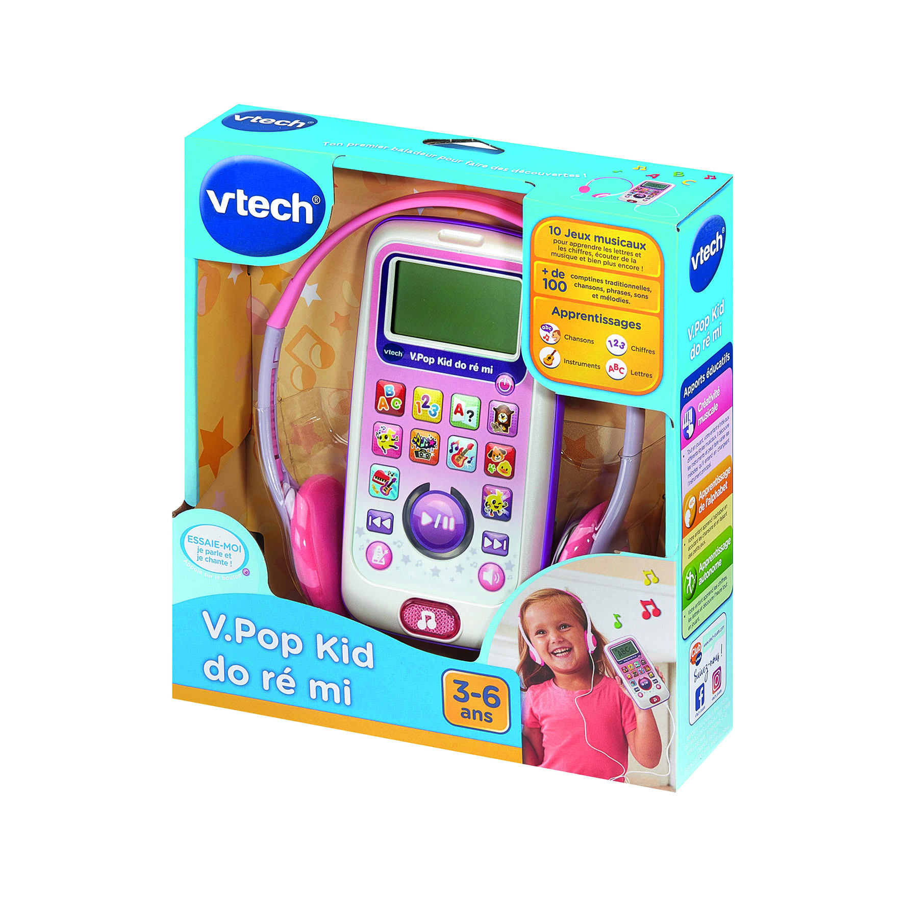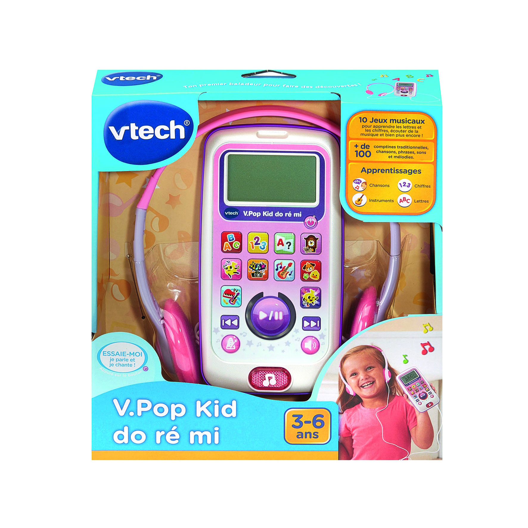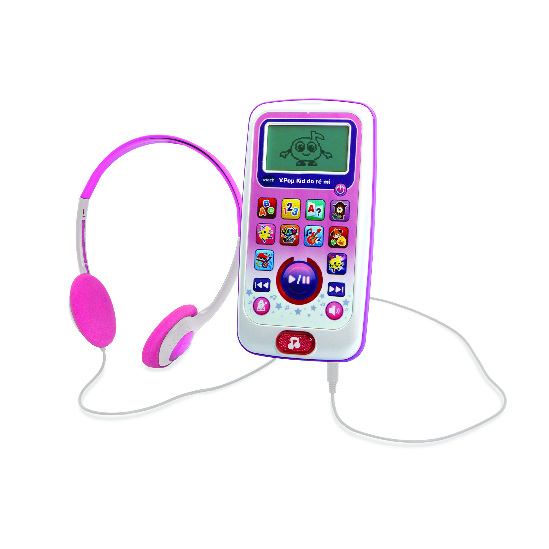 V.Pop Kid Do Ré Mi (couleur rose) est un baladeur musical interactif qui initie les enfants à la musique tout en les accompagnant dans l’apprentissage de l’alphabet et des chiffres.