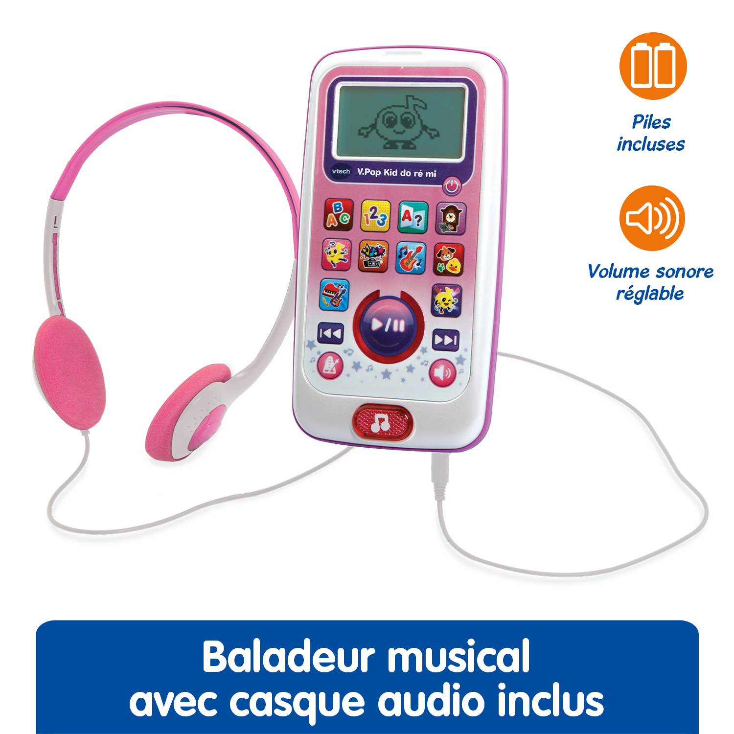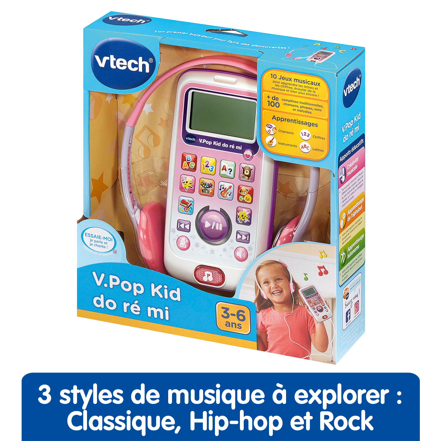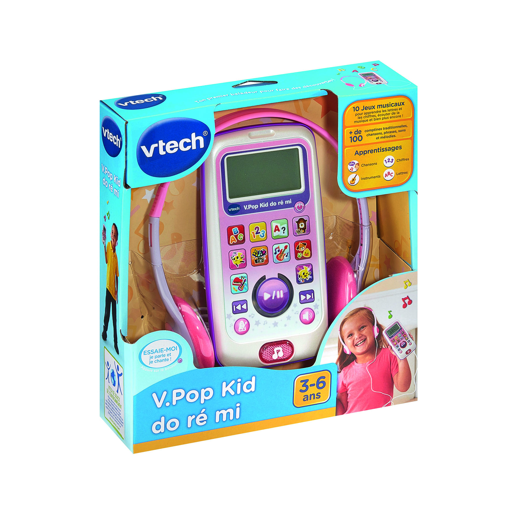 V.Pop Kid Do Ré Mi (couleur rose) est un baladeur musical interactif qui initie les enfants à la musique tout en les accompagnant dans l’apprentissage de l’alphabet et des chiffres.